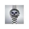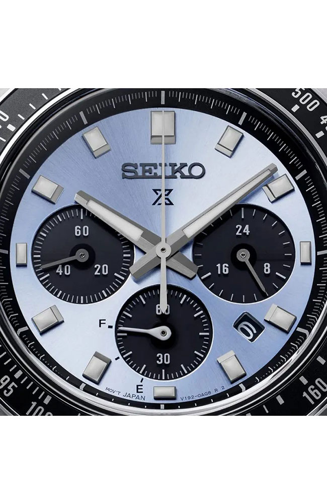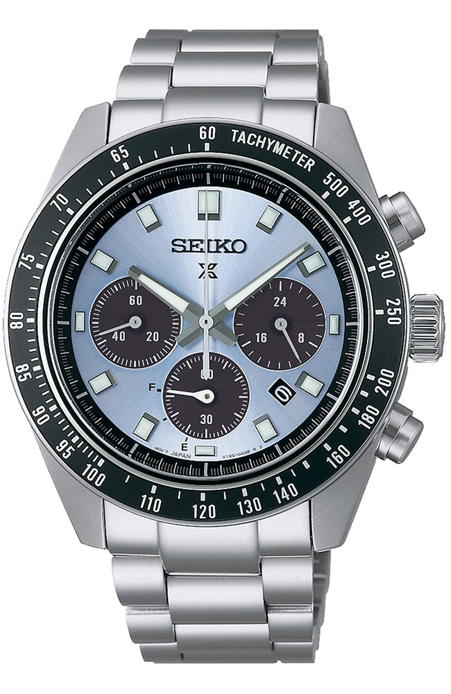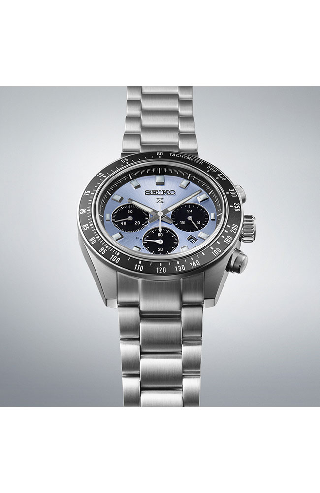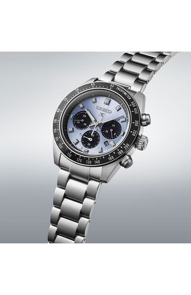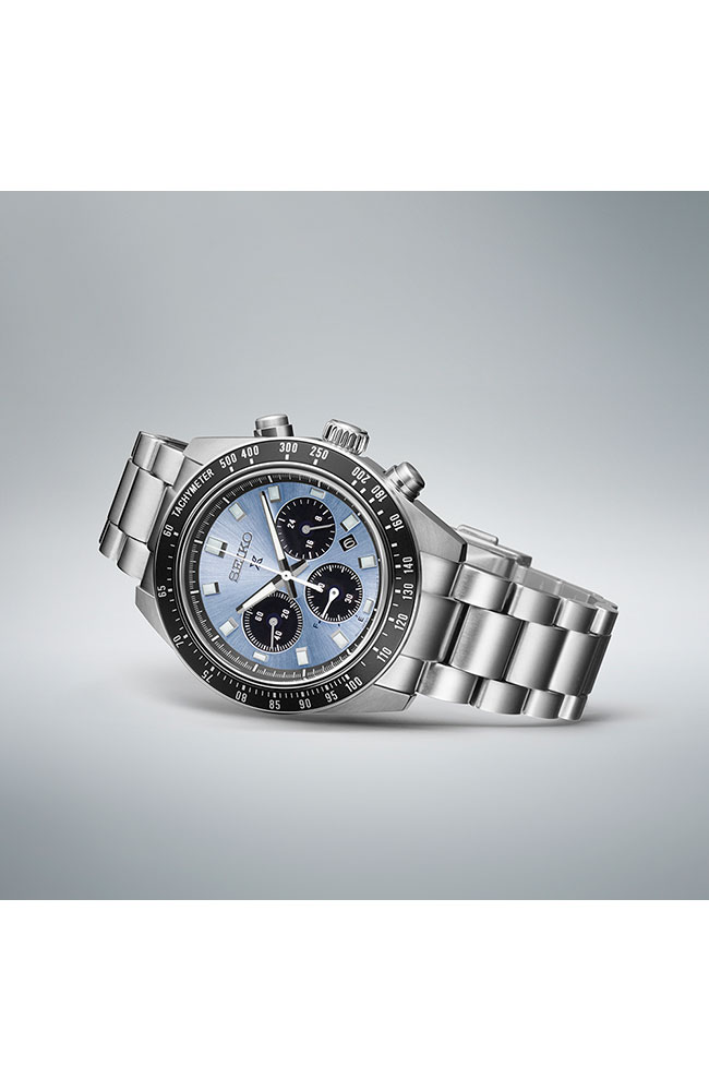 Αυτός ο solar χρονογράφος προέρχεται από τη συλλογή ρολογιών Prospex Speedtimer που αντιπροσωπεύει την κληρονομιά επαγγελματικής χρονομέτρησης της Seiko. Στη δεκαετία του 1960, η Seiko αναγγέλθηκε στη διεθνή αθλητική σκηνή χρονομέτρησης με μια εντελώς νέα γενιά εξοπλισμού υψηλής ακρίβειας που εγκρίθηκε από τις διεθνείς αθλητικές ομοσπονδίες σε πολλά από τα κορυφαία αθλητικά γεγονότα του κόσμου. Το μπλε χρώμα και το sunray μοτίβο του καντράν έχουν σχεδιαστεί έτσι ώστε να θυμίζουν το κρυστάλλινο τρόπαιο που απονέμεται στους αθλητές σε αγώνες υψηλού προφίλ. Είναι σχεδιασμένο με τις ίδιες προδιαγραφές μεγέθους με τα πιο δημοφιλή Prospex Speedtimers: 41,4 χιλιοστά. Το κρύσταλλο ζαφειριού έχει ισχυρή αντοχή στις γρατσουνιές καθώς και αντιανακλαστική επίστρωση στην εσωτερική του επιφάνεια. Ως Speedtimer Prospex, αυτό το ρολόι διαθέτει λειτουργία χρονογράφου, που του επιτρέπει να μετράει το χρόνο που έχει περάσει. Τροφοδοτείται από τον in-house Solar μηχανισμό V192 και μπορεί να φορτιστεί τόσο από συνθήκες φυσικού όσο και τεχνητού φωτός για να διατηρεί την ακρίβεια +/- 15 δευτερόλεπτα ανά μήνα. Διαθέτει χρήσιμη ένδειξη power reserve στο 7.