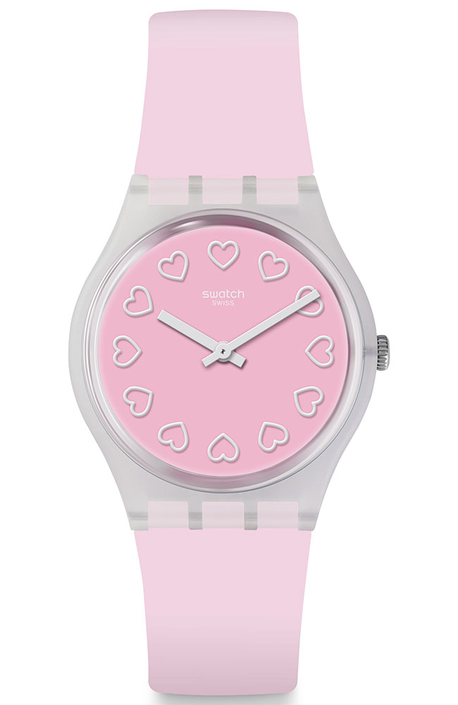 Γυναικείο ρολόι χειρός Swatch ελβετικής κατασκευής με ροζ καντράν και ροζ καουτσούκ λουράκι.