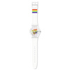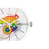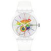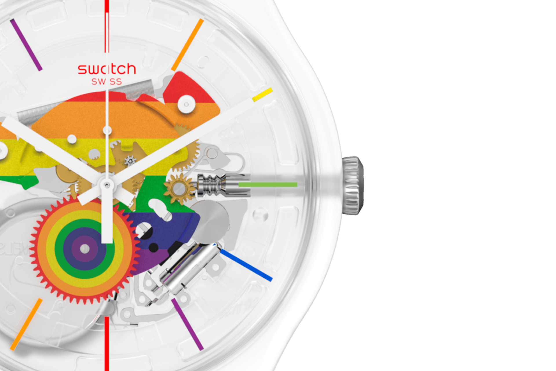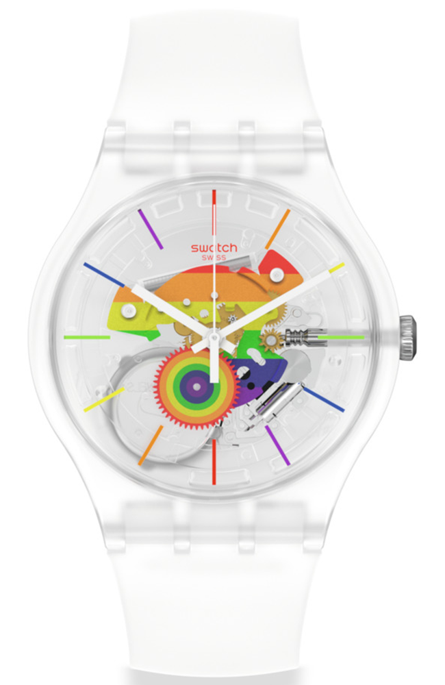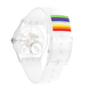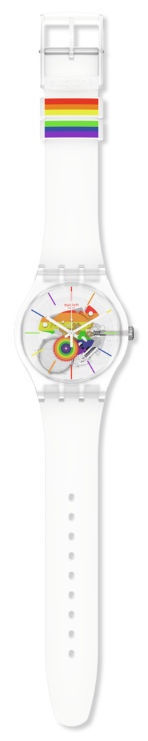 Ρολόι χειρός Swatch ελβετικής κατασκευής με διάφανο καντράν και καουτσούκ λουράκι. Ένα εντυπωσιακό ρολόι που φοράς με Υπερηφάνεια. Με ημιδιαφανές λουράκι σιλικόνης και εντυπωσιακά φωτεινή εκτύπωση του ουράνιου τόξου.