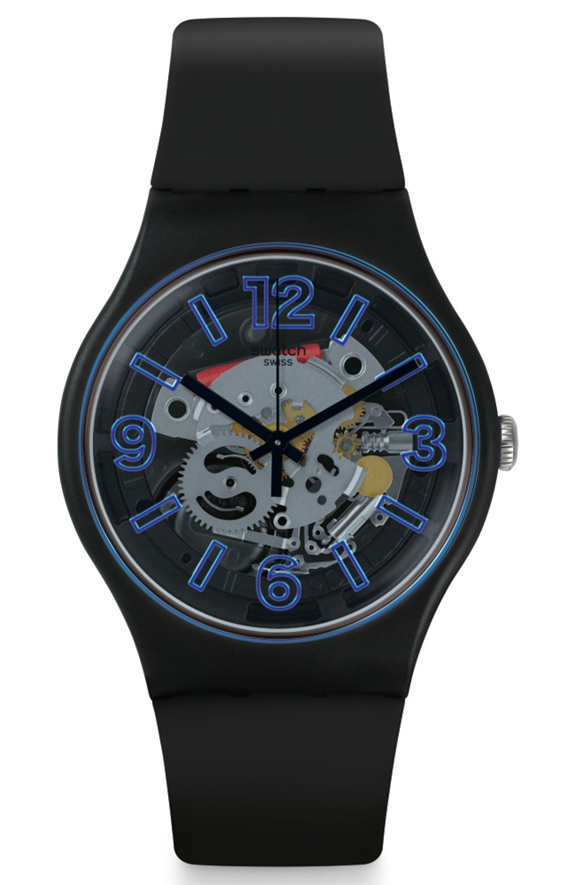 Ρολόι ελβετικής κατασκευής Swatch με μαύρο καντράν και μαύρο καουτσούκ λουράκι.