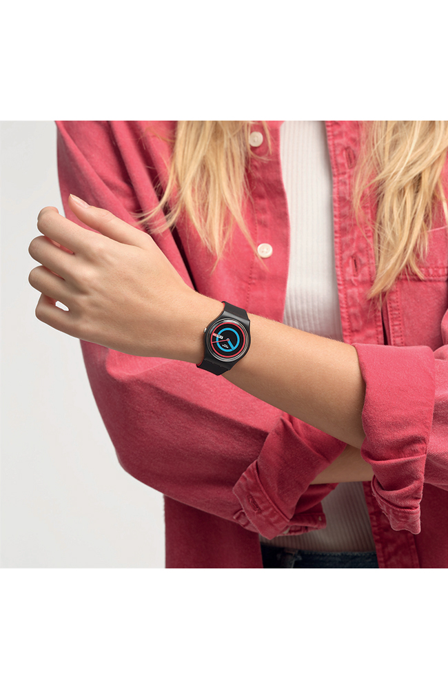 Σε αυτό το ρολόι GENT BIOSOURCED πρωταγωνιστούν το μαύρο καντράν με την κόκκινη, μπλε και λευκή εκτύπωση, η ένδειξη ημέρας-ημερομηνίας και το τζάμι από υλικό βιολογικής προέλευσης, με φόντο το μαυροκόκκινο λουράκι σιλικόνης. Ένα μοναδικό χαρακτηριστικό του καντράν είναι ότι το χρώμα του εσωτερικού και εξωτερικού κύκλου αντιστοιχεί στους ωροδείκτες και τους λεπτοδείκτες.