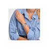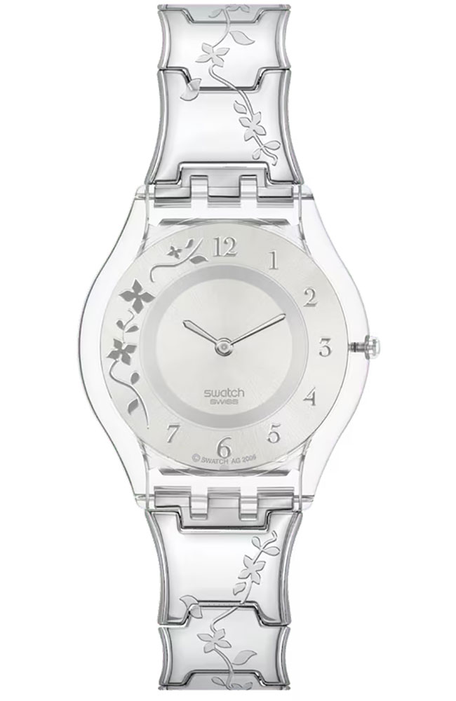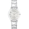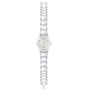 Γυναικείο ρολόι χειρός Swatch ελβετικής κατασκευής με ασημί καντράν και μπρασελέ.
