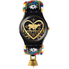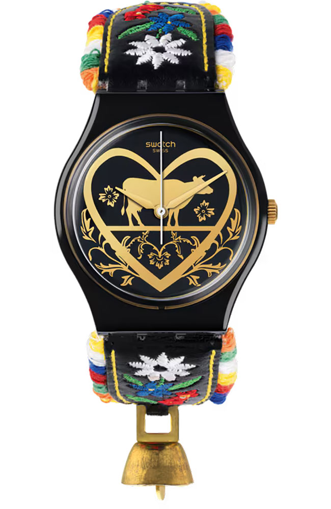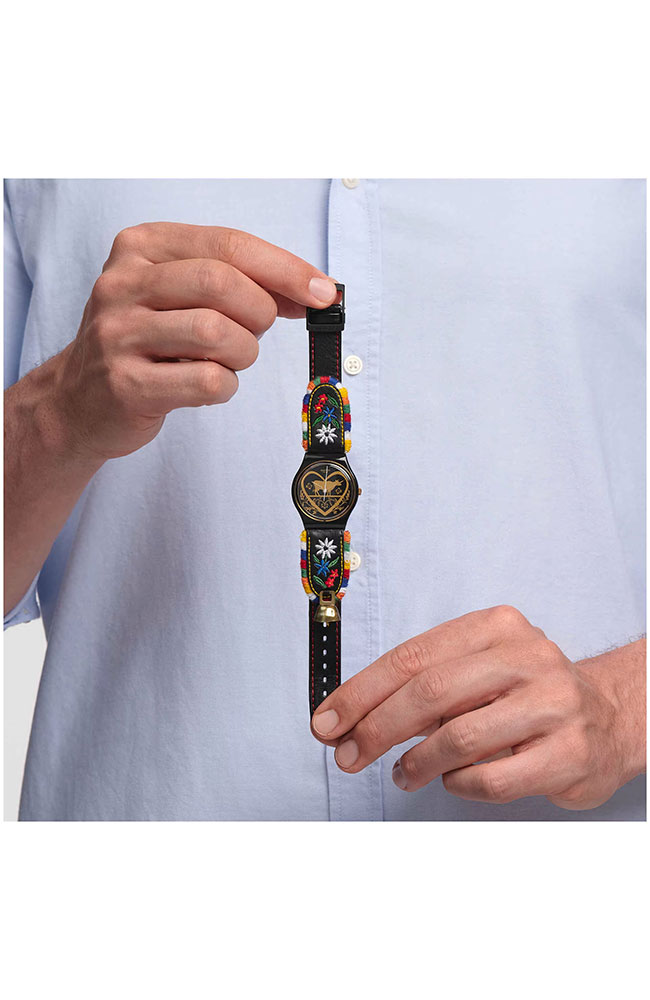 Ένας εντυπωσιακός συνδυασμός υφής και μοτίβου, το ρολόι DIE GLOCKE (GB285) αποτελεί ένα σύγχρονο εμβληματικό κομμάτι. Αυτό το κομψό ρολόι ξεκινά με ένα επιχρυσωμένο καντράν με καθρέφτη, διακοσμημένο με μαύρες εκτυπώσεις και ένα ποιμενικό μοτίβο. Η γυαλιστερή μαύρη κάσα συνδυάζεται με μαύρο δερμάτινο λουράκι, διακοσμημένο με πολύχρωμο λουλουδάτο κέντημα και μια προσαρτημένη λεπτομέρεια κουδουνιού αγελάδας.