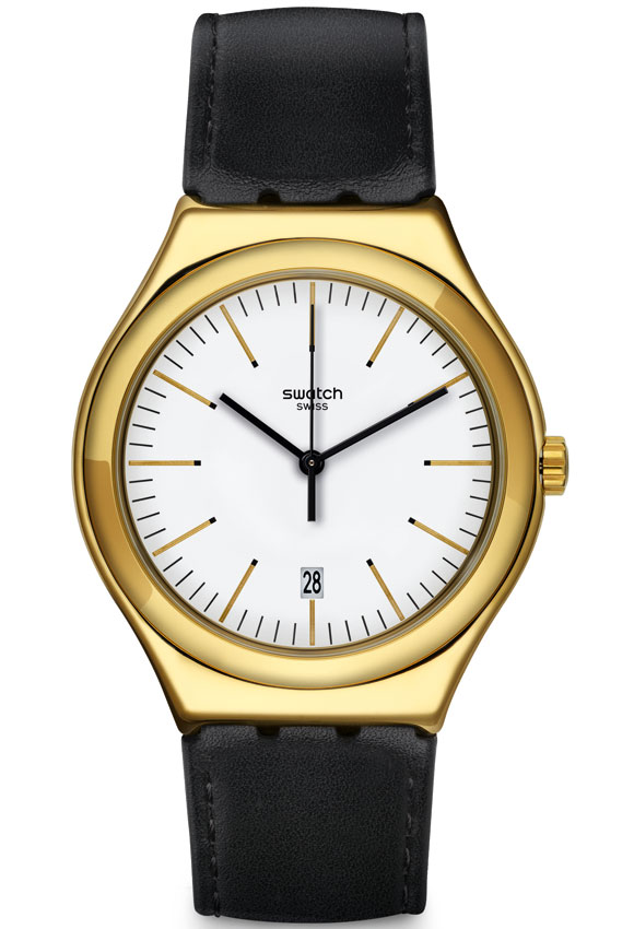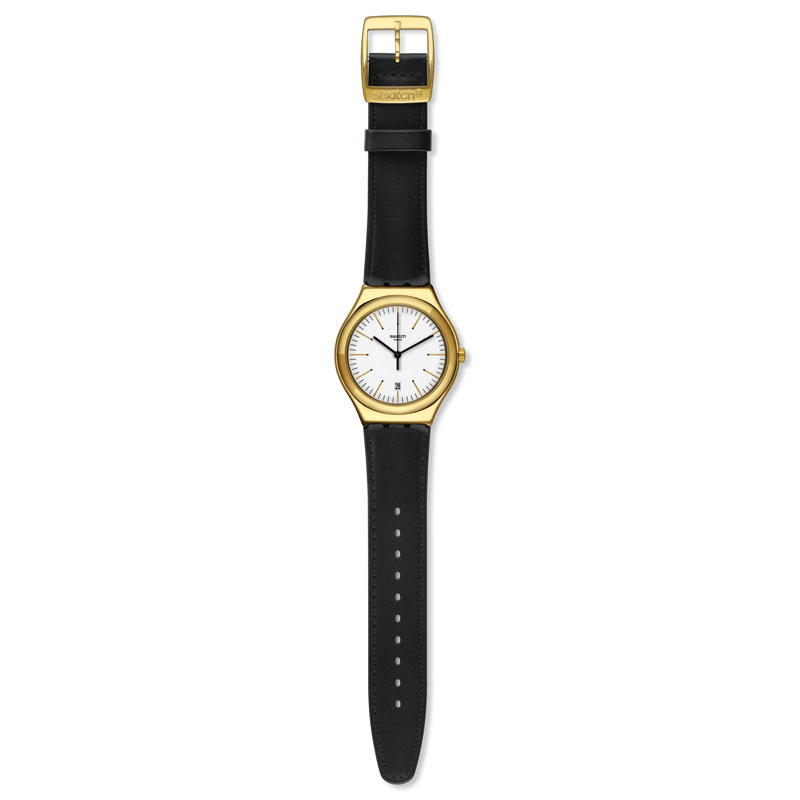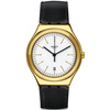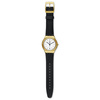 Ρολόι ελβετικής κατασκεύης Swatch με λευκό καντράν και μαύρο δερμάτινο λουράκι.