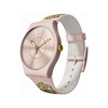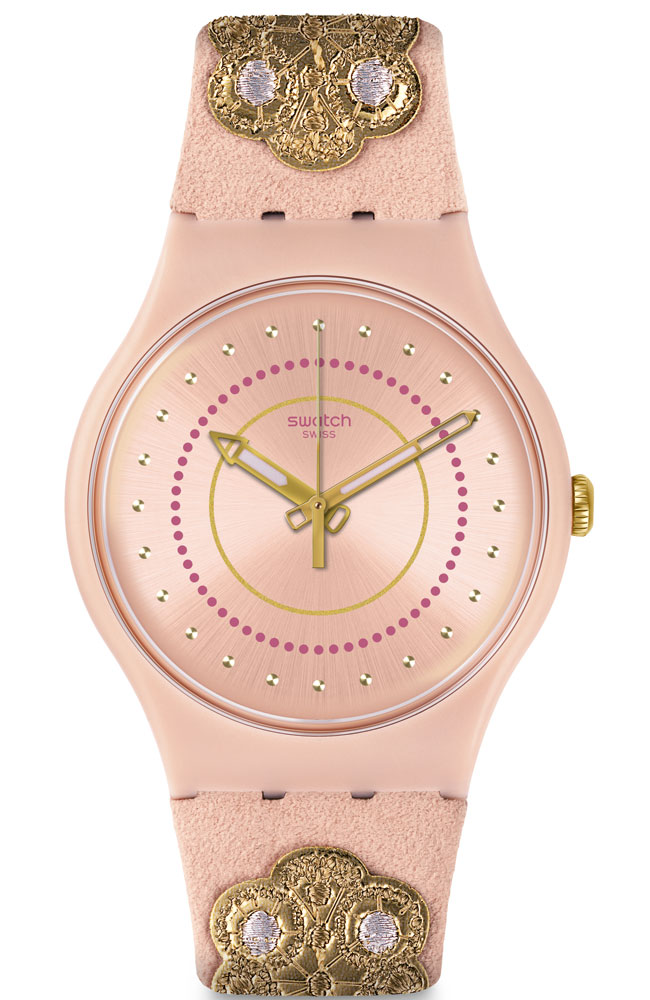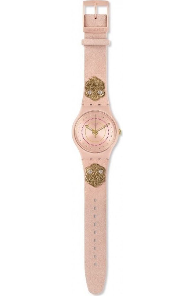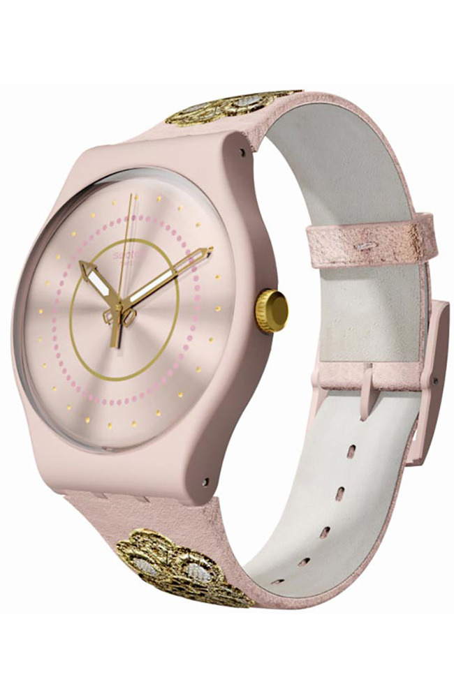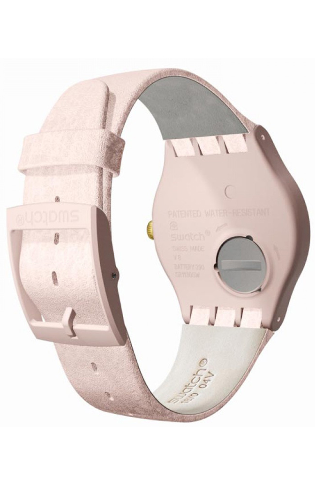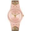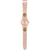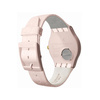 Γυναικείο ρολόι ελβετικής κατασκεύης Swatch με ροζ καντράν και ροζ δερμάτινο λουράκι.