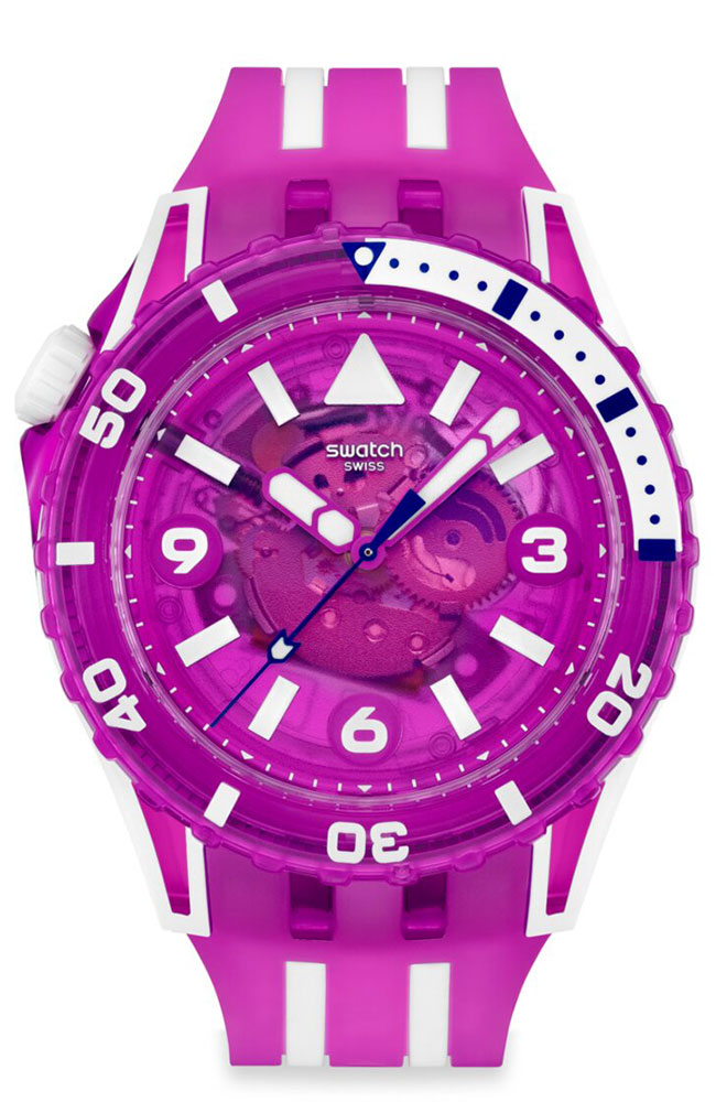 Κάτω από το τζάμι βιολογικής προέλευσης, αυτό το καταδυτικό ρολόι διαθέτει διαφανές ροζ καντράν με λευκές τυπωμένες ενδείξεις και αριθμούς, ροζ ωροδείκτη και λεπτοδείκτη και σκούρο μπλε δείκτη δευτερολέπτων, που λάμπουν όλα στο σκοτάδι. Η κάσα συνδυάζει λευκό ματ Bioceramic και γυαλιστερό, διαφανές ροζ υλικό βιολογικής προέλευσης και συνοδεύεται από γυαλιστερή, διαφανή, ροζ στεφάνη βιολογικής προέλευσης με λευκή και σκούρα μπλε εκτύπωση που λάμπει στο σκοτάδι και λευκή ματ κορώνα Bioceramic στη θέση της ώρας 10. Το ρολόι ολοκληρώνουν το λουράκι σε λευκό ματ και διαφανές ροζ ματ, με διαφανές ροζ ματ θηλάκι και γυαλιστερό, διαφανές κούμπωμα.