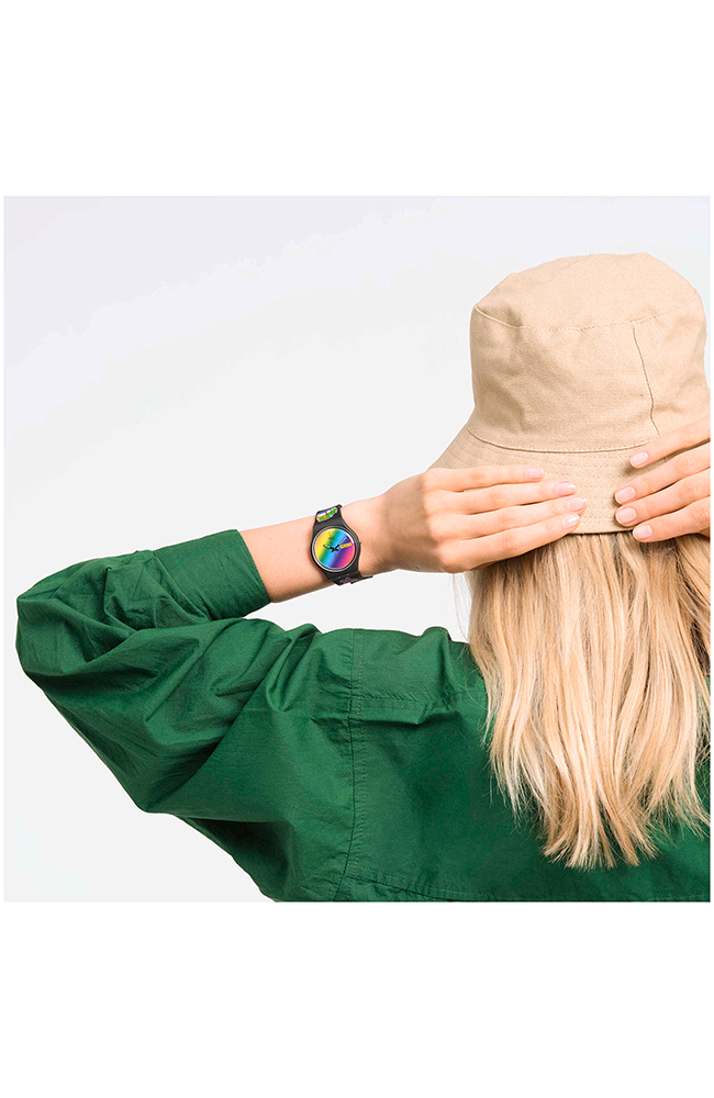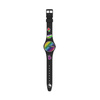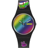 Ρολόι χειρός Swatch ελβετικής κατασκευής με πολύχρωμο καντράν και καουτσούκ λουράκι.