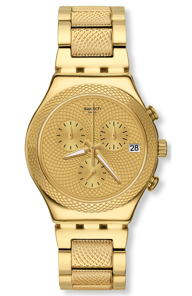 Ρολόι Χρονογράφος ελβετικής κατασκευής Swatch με χρυσό καντράν και χρυσό μπρασελέ.