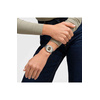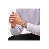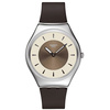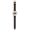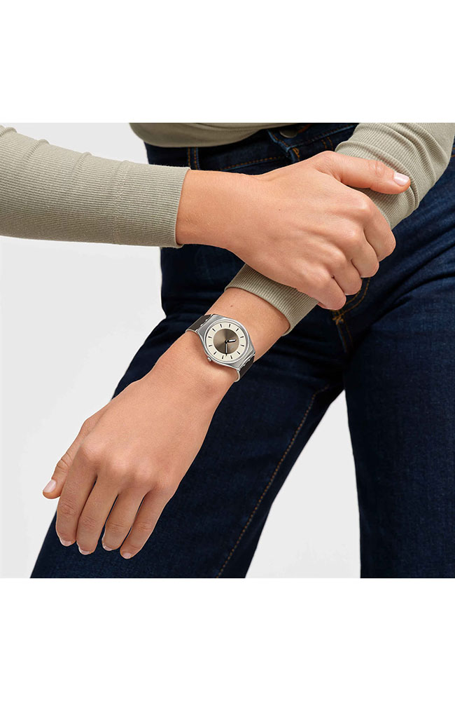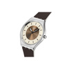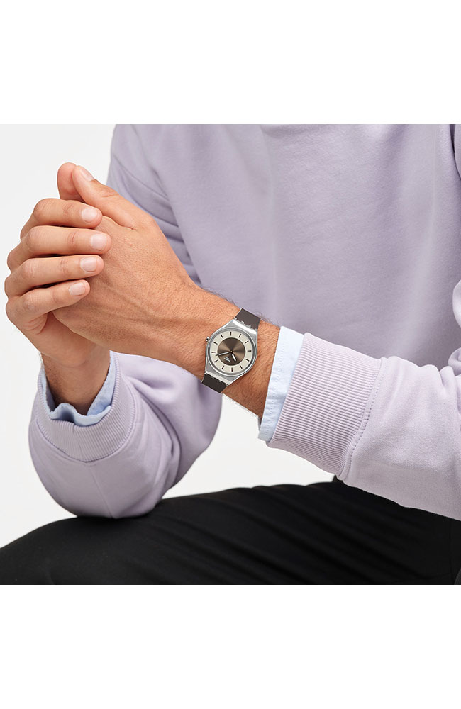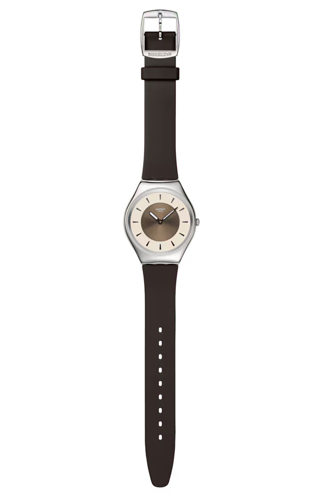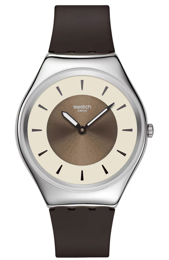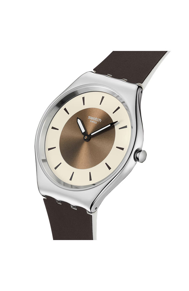 Αυτό το εξαιρετικά λεπτό ρολόι περιλαμβάνει καντράν σε ανοιχτό καφέ χρώμα με sun-brushed φινίρισμα, ιβουάρ τυπωμένο εξωτερικό δακτύλιο, τυπωμένες ενδείξεις της ώρας σε σκούρο καφέ χρώμα και μαύρο ωροδείκτη και λεπτοδείκτη που λάμπουν στο σκοτάδι. Η κάσα και το κούμπωμα από γυαλιστερό ανοξείδωτο ατσάλι συνοδεύονται από σκούρο καφέ ματ λουράκι με ιβουάρ ματ πίσω πλευρά και σκούρο καφέ ματ θηλάκι.