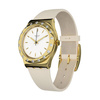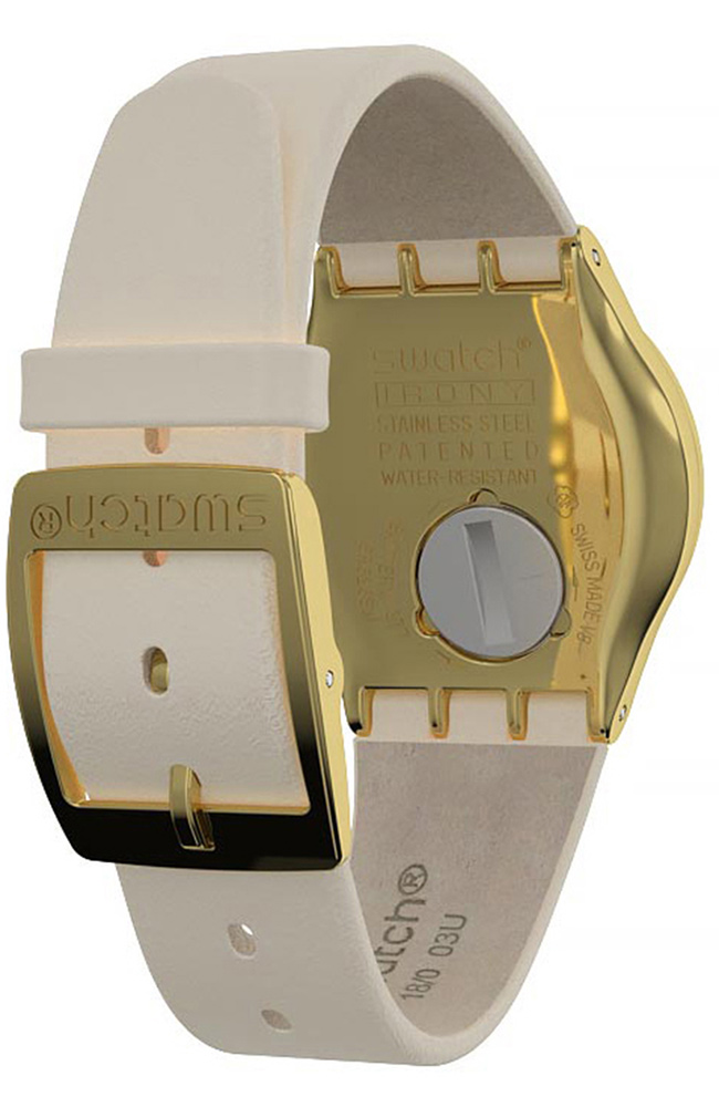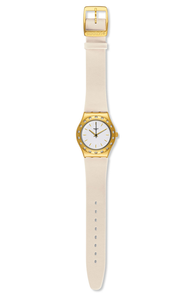Γυναικείο ρολόι χειρός Swatch ελβετικής κατασκευής με λευκό καντράν και μπεζ δερμάτινο λουράκι.