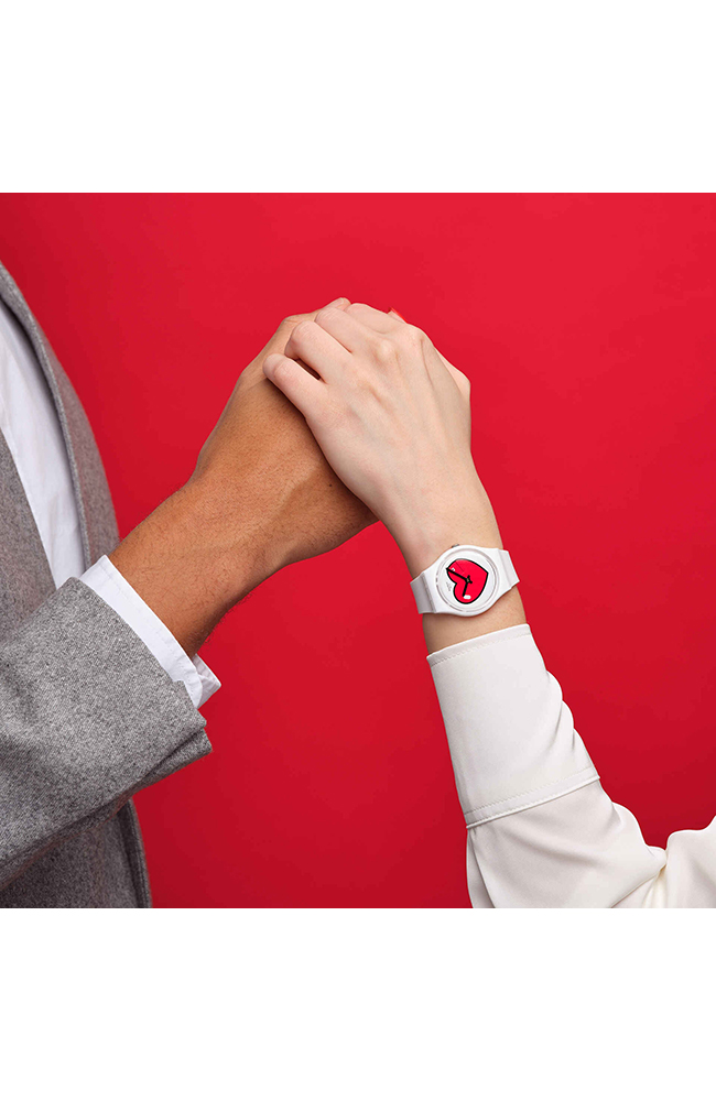 Αυτό το ρολόι της συλλογής της Ημέρας του Αγίου Βαλεντίνου διαθέτει αμιγώς λευκή πλαστική κάσα και λευκό λουράκι σιλικόνης. Το λευκό καντράν με τους εντυπωσιακούς μαύρους δείκτες έχει μια κόκκινη καρδιά και διαθέτει ένδειξη ημερομηνίας στο σημείο ώρα 3 στο οποίο εμφανίζονται διαφορετικά emoticon αγάπης.