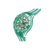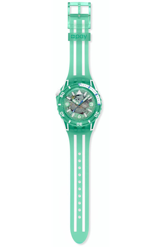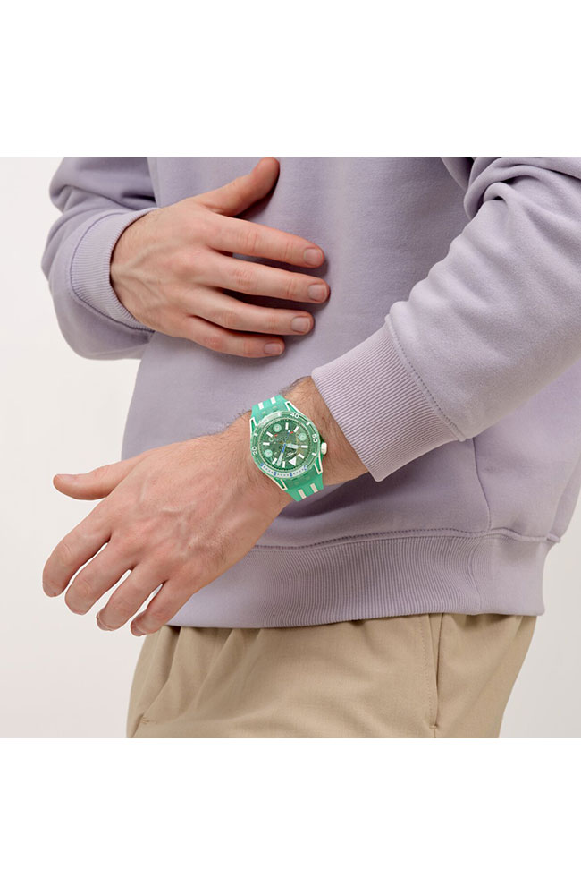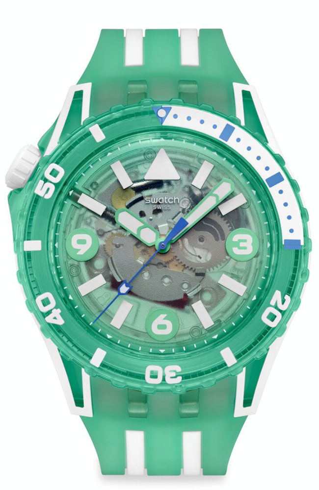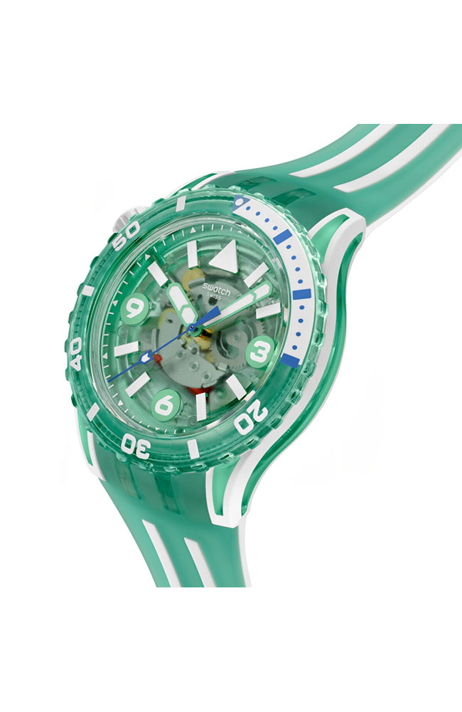 Κάτω από το τζάμι βιολογικής προέλευσης, αυτό το καταδυτικό ρολόι διαθέτει διαφανές τιρκουάζ καντράν με λευκές τυπωμένες ενδείξεις και αριθμούς, τιρκουάζ ωροδείκτη και λεπτοδείκτη και δείκτη δευτερολέπτων σε ανοιχτό μπλε, που λάμπουν όλα στο σκοτάδι. Η κάσα συνδυάζει λευκό ματ Bioceramic και γυαλιστερό, διαφανές τιρκουάζ υλικό βιολογικής προέλευσης και συνοδεύεται από γυαλιστερή, διαφανή τιρκουάζ στεφάνη βιολογικής προέλευσης με εκτύπωση σε λευκό και ανοιχτό μπλε χρώμα που λάμπει στο σκοτάδι και λευκή ματ κορώνα Bioceramic στη θέση της ώρας 10. Το ρολόι ολοκληρώνουν το λουράκι σε λευκό ματ και διαφανές τιρκουάζ ματ, με διαφανές τιρκουάζ ματ θηλάκι και γυαλιστερό, διαφανές τιρκουάζ κούμπωμα.
