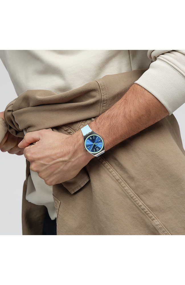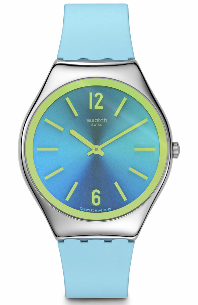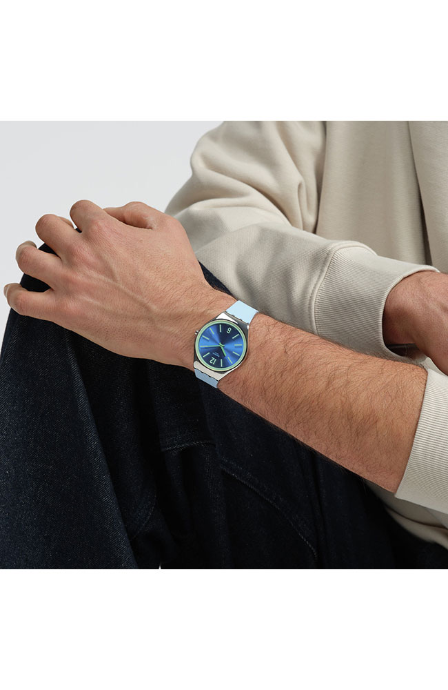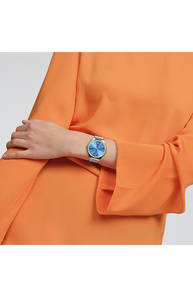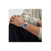 Αυτό το εξαιρετικά λεπτό ρολόι από ανοξείδωτο ατσάλι διαθέτει sun-brushed μπλε καντράν και κίτρινο ωροδείκτη και λεπτοδείκτη που λάμπουν κάτω από το τζάμι με εφέ Solar Spectrum με τις κίτρινες εκτυπωμένες ενδείξεις. Μέρος αυτού του κομψού κομματιού είναι και η αντίθεση που δημιουργεί το ανοιχτό μπλε λουράκι σε σχέση με την κάσα και το κούμπωμα από ανοξείδωτο ατσάλι.