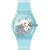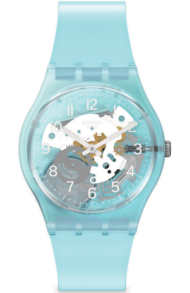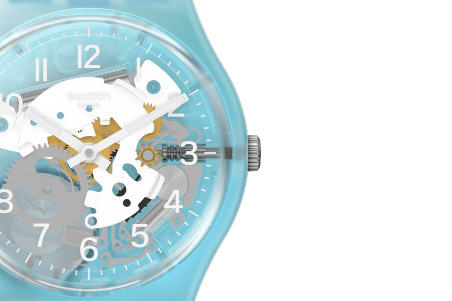 Ρολόι χειρός Swatch ελβετικής κατασκευής με διάφανο καντράν και καουτσούκ λουράκι.
