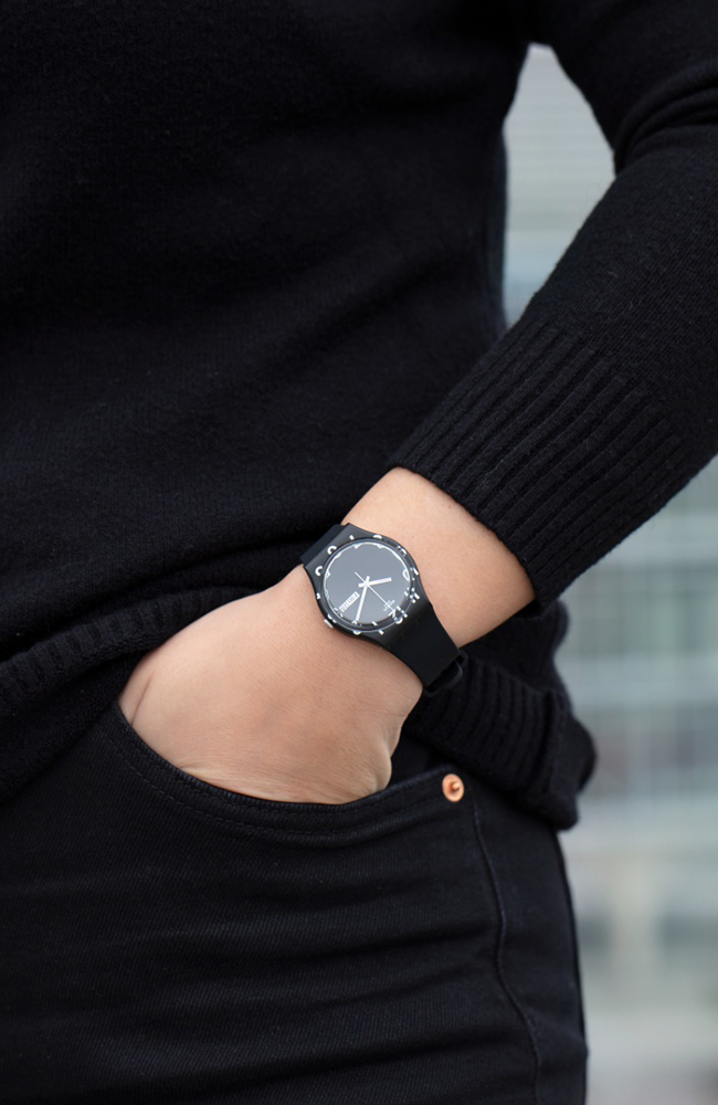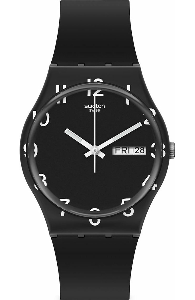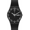 Γυναικείο ρολόι χειρός Swatch ελβετικής κατασκευής με μαύρο καντράν και καουτσούκ λουράκι.