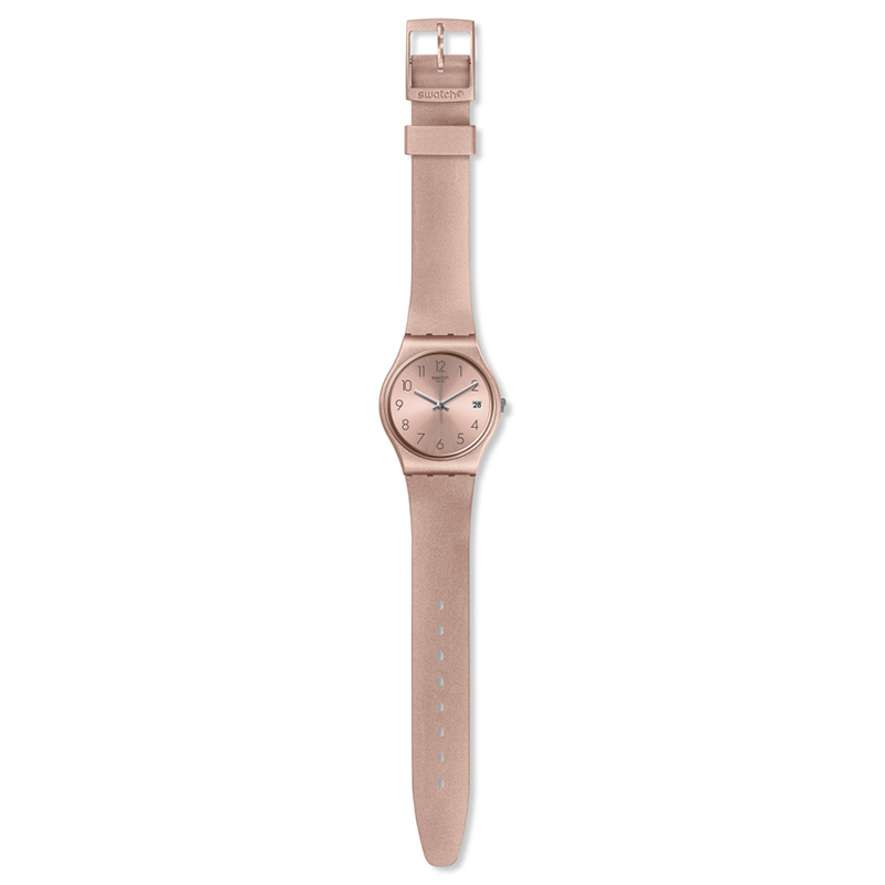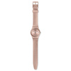 Γυναικείο ρολόι Ελβετικής κατασκευής Swatch με ροζ χρυσό καντραν και ροζ χρυσό καουτσούκ λουράκι.