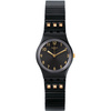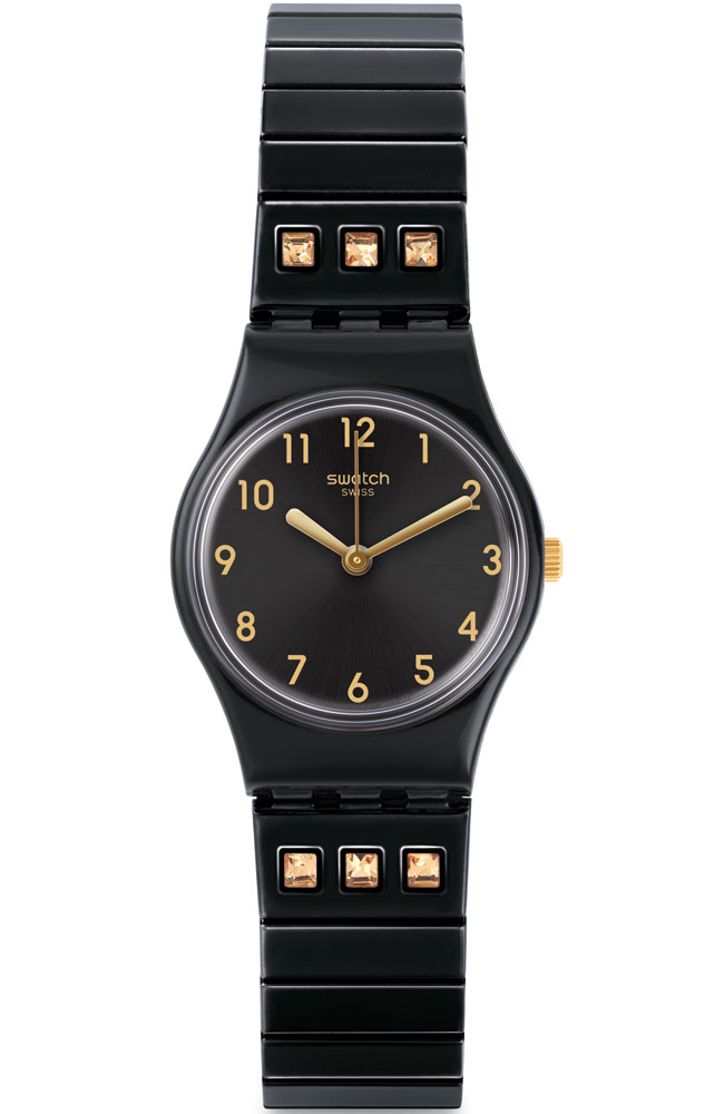 Γυναικείο ρολόι ελβετικής κατασκευής Swatch με μαύρο καντράν, πέτρες ζιργκόν και μπρασελέ.
