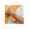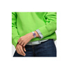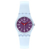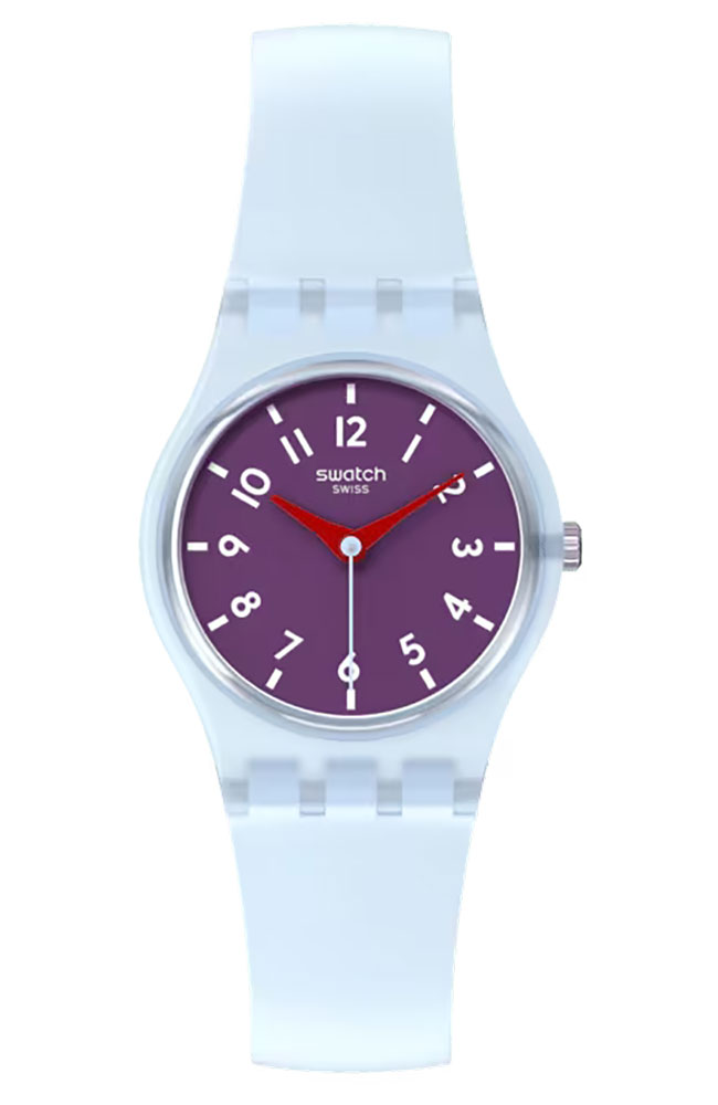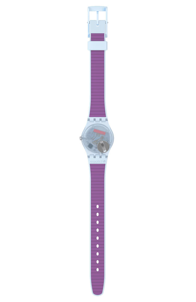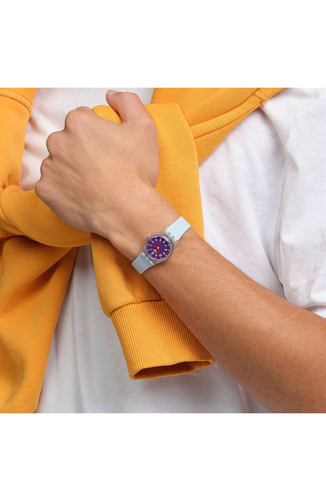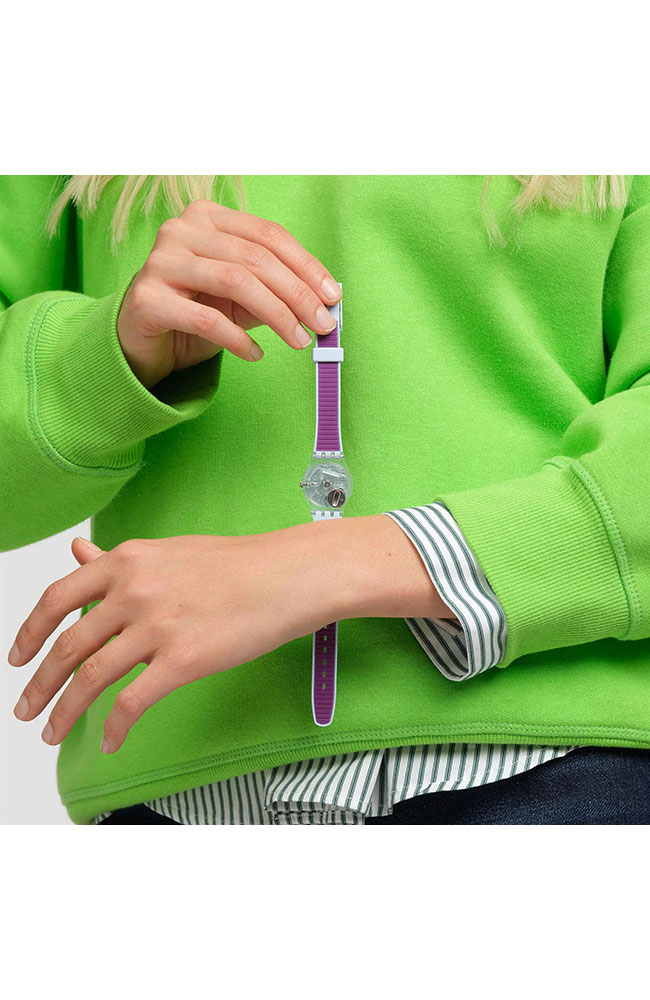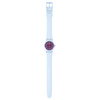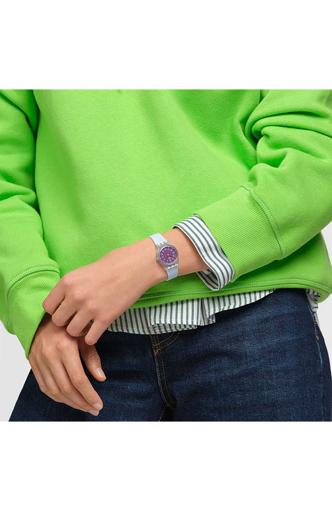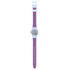 Γυναικείο ρολόι χειρός Swatch ελβετικής κατασκευής με μωβ καντράν και καουτσούκ λουράκι.