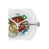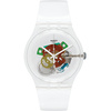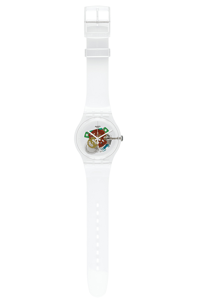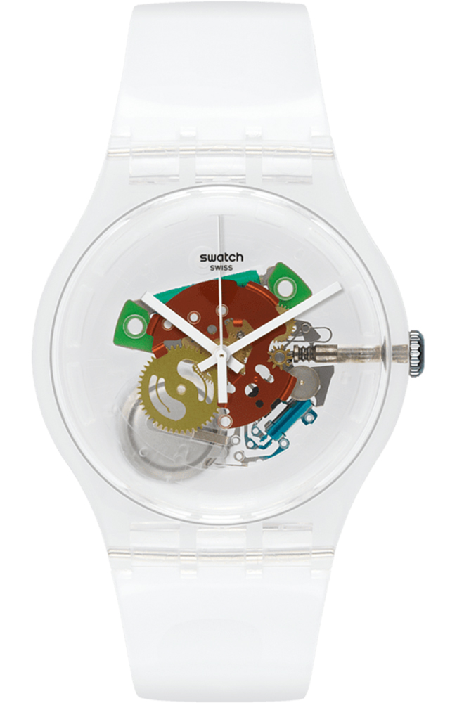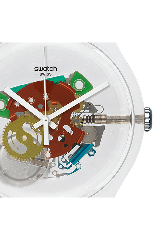 Ρολόι χειρός Swatch ελβετικής κατασκευής με διάφανο καντράν και καουτσούκ λουράκι.