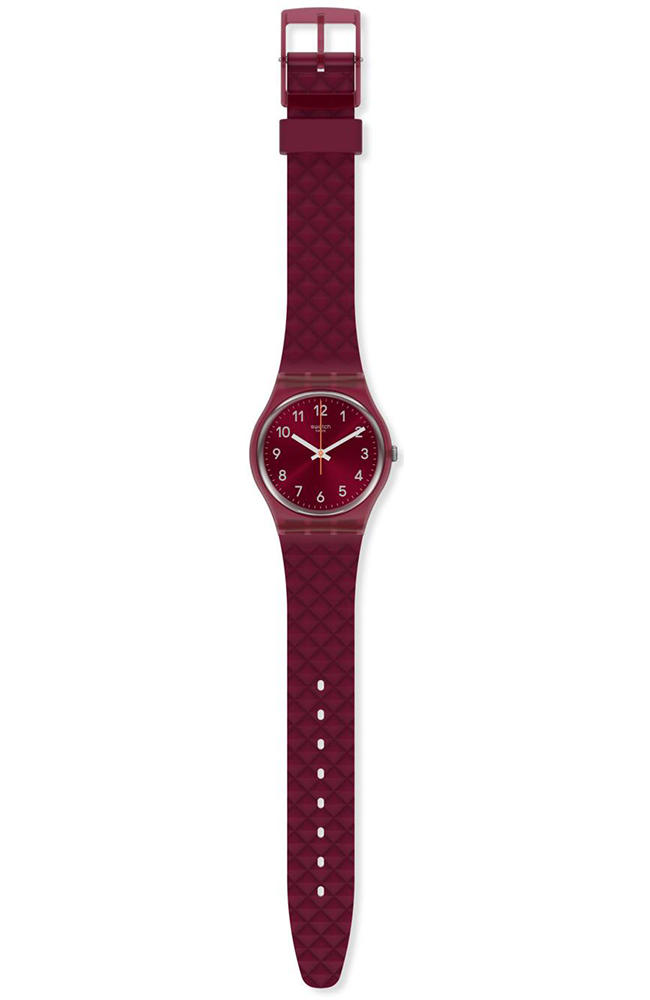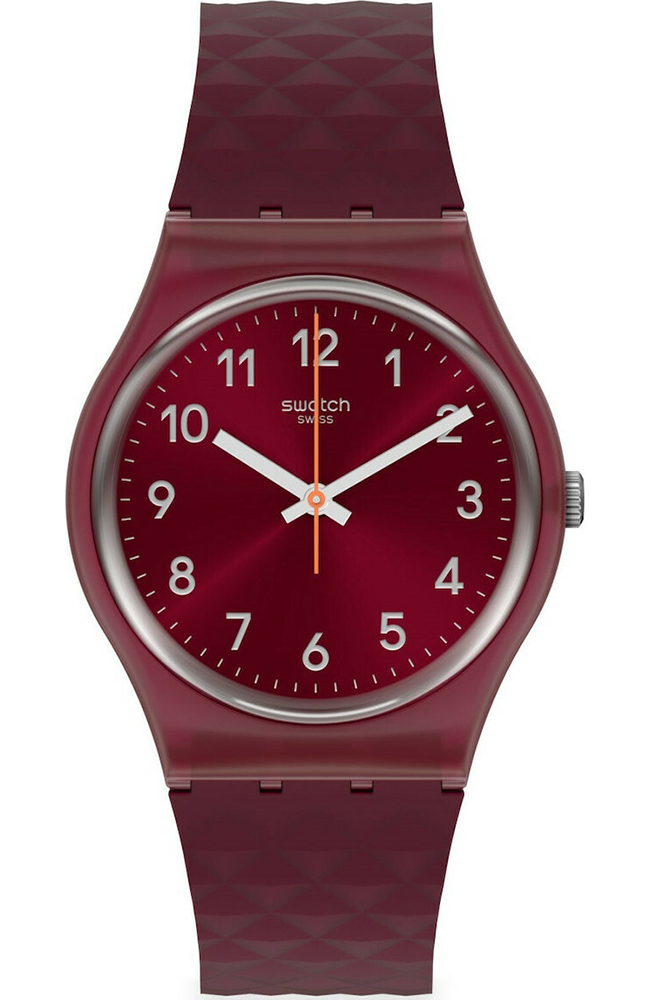 Γυναικείο ρολόι χειρός Swatch ελβετικής κατασκευής με κόκκινο καντράν και καουτσούκ λουράκι.