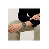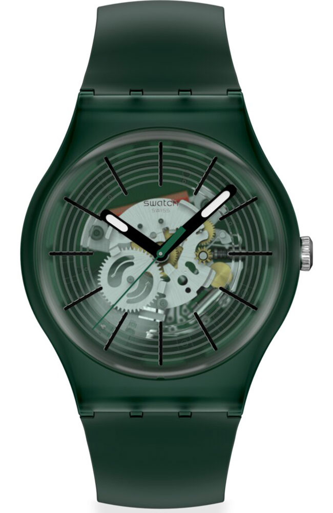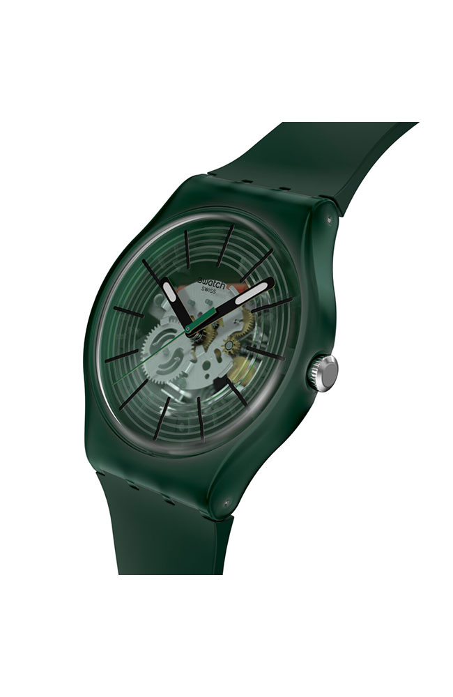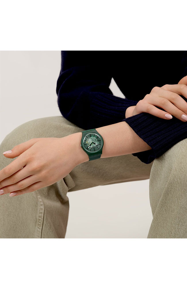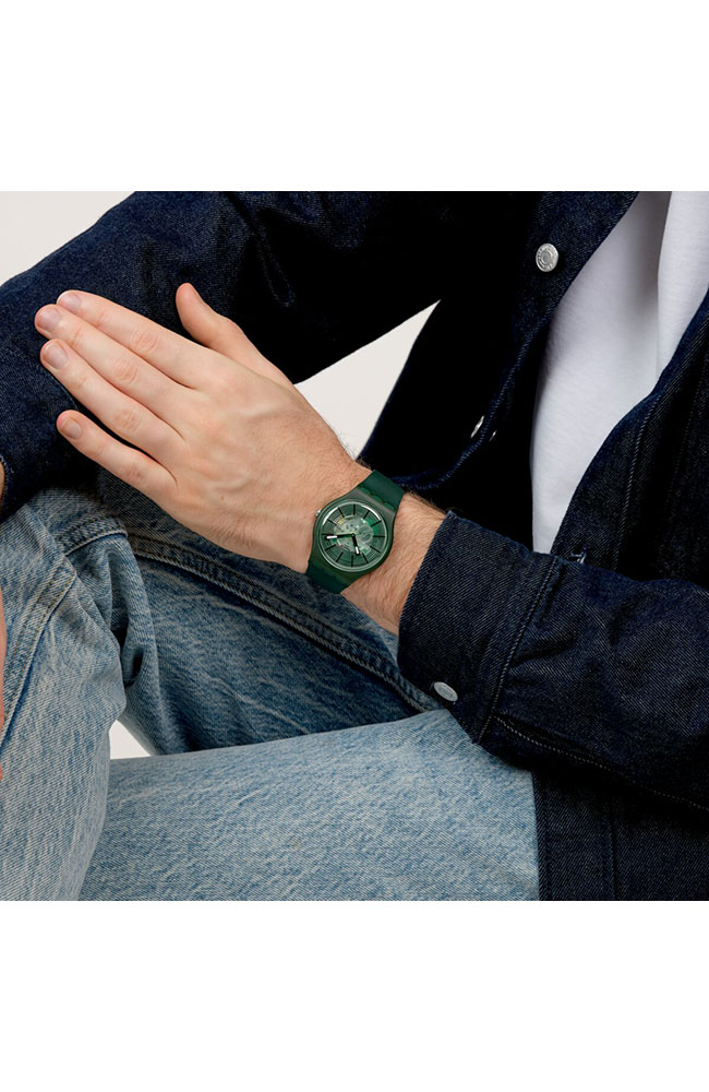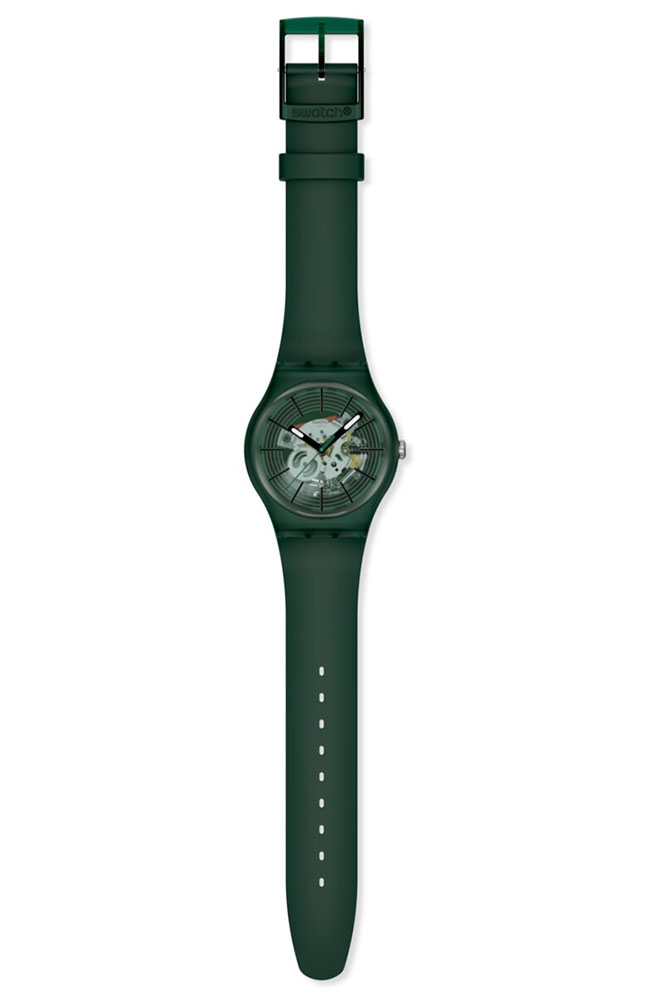 Αυτό το ρολόι διαθέτει διαφανές σκούρο πράσινο καντράν με τυπωμένους κύκλους σε σκούρο πράσινο, τυπωμένους μαύρους δείκτες ώρας, μαύρο ωροδείκτη και λεπτοδείκτη με εφέ που λάμπει στο σκοτάδι, καθώς και σκούρο πράσινο δείκτη δευτερολέπτων, μέσα σε διαφανή ματ σκούρα πράσινη κάσα βιολογικής προέλευσης με βιολογικής προέλευσης τζάμι. Το ματ σκούρο πράσινο βιολογικής προέλευσης λουράκι συμπληρώνεται από αντίστοιχο θηλάκι και διαφανές ματ σκούρο πράσινο κούμπωμα.