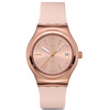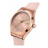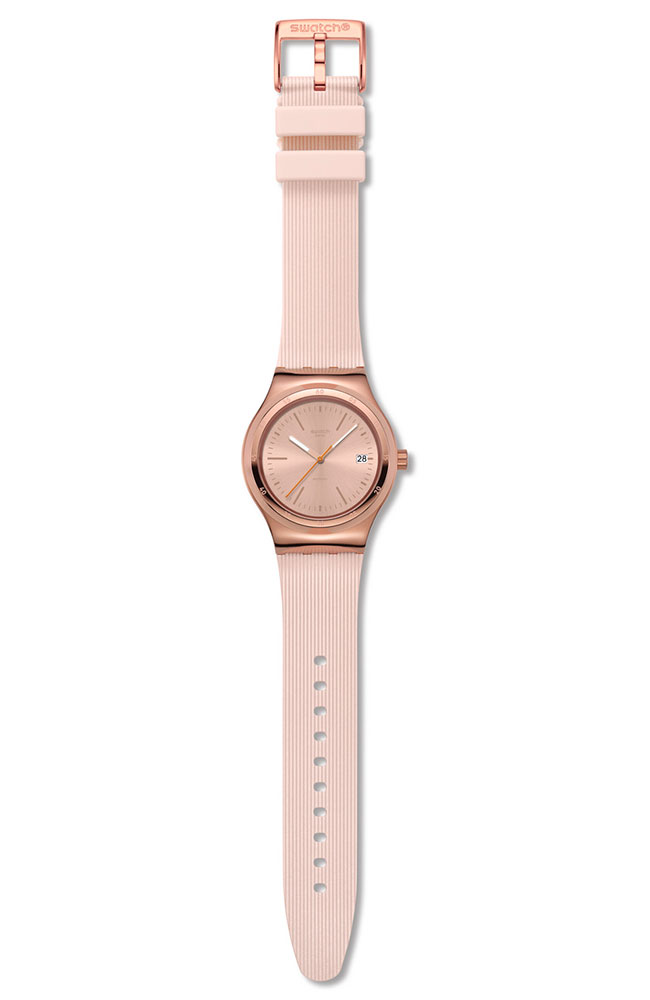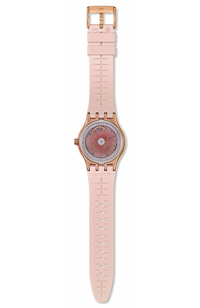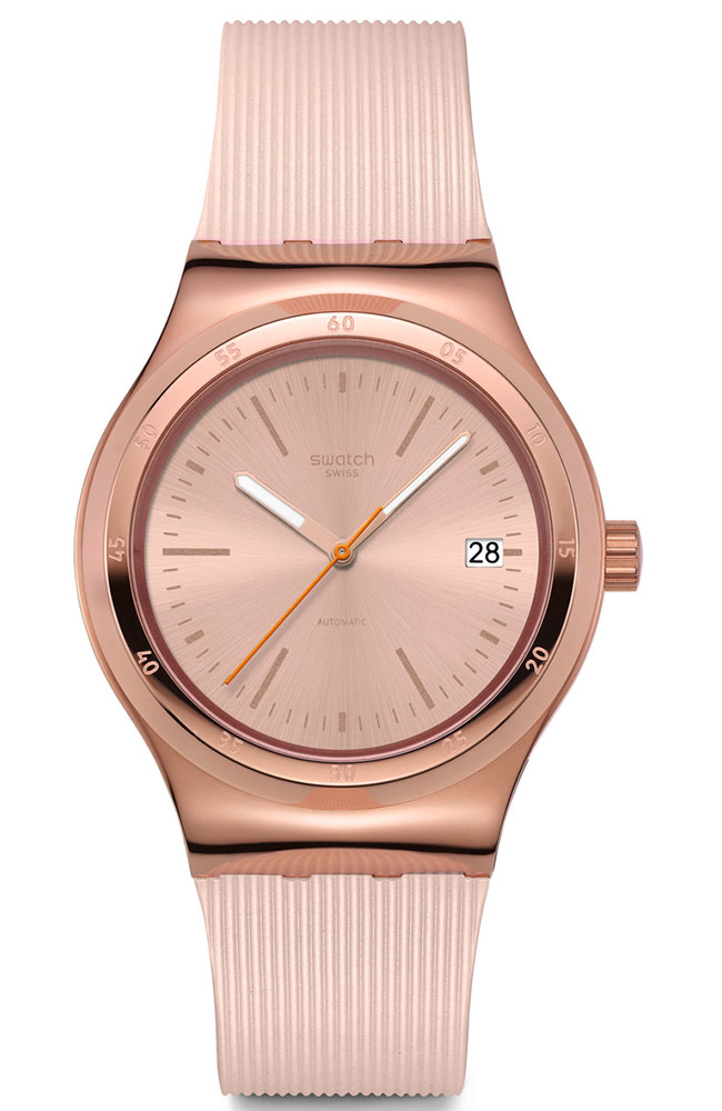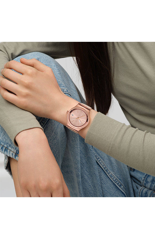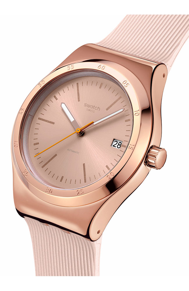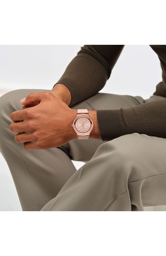 Αυτό το αυτόματο ρολόι διαθέτει μπεζ καντράν με sun-brushed φινίρισμα, αστραφτερές χρυσαφί τυπωμένες ενδείξεις και ζώνη ενδείξεων λεπτών, καθώς και ένδειξη ημερομηνίας στη θέση της ώρας 3. Την ώρα δείχνουν ο τριανταφυλλί-χρυσαφί ωροδείκτης και λεπτοδείκτης που λάμπουν στο σκοτάδι και ο πορτοκαλί δείκτης δευτερολέπτων. Η κάσα από γυαλιστερό ανοξείδωτο ατσάλι με τριανταφυλλί-χρυσαφί PVD συμπληρώνεται από ταιριαστή στεφάνη και επιτρέπει να φαίνεται ο μηχανισμός SISTEM51 με ψηφιακό τυπωμένο σχέδιο στην πίσω πλευρά. Το look του ρολογιού συμπληρώνουν το ανάγλυφο λουράκι σε ανοιχτό μπεζ με χαρακτηριστικά Anodamazing, τα θηλάκια σε ανοιχτό μπεζ ματ και το μισό κούμπωμα από γυαλιστερό ανοξείδωτο ατσάλι με τριανταφυλλί-χρυσαφί PVD.