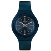 Γυναικείο ρολόι χειρός Swatch ελβετικής κατασκευής με μπλε καντράν και μπλε καουτσούκ λουράκι.