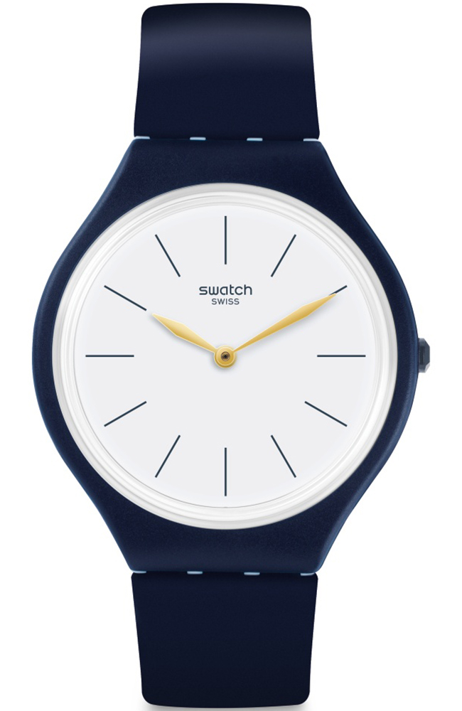 Γυναικείο ρολόι ελβετικής κατασκευής Swatch με λευκό καντράν και μπλε καουτσούκ λουράκι.