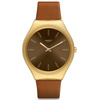 Γυναικείο ρολόι ελβετικής κατασκευής Swatch με καφέ καντράν και καφέ δερμάτινο λουράκι.