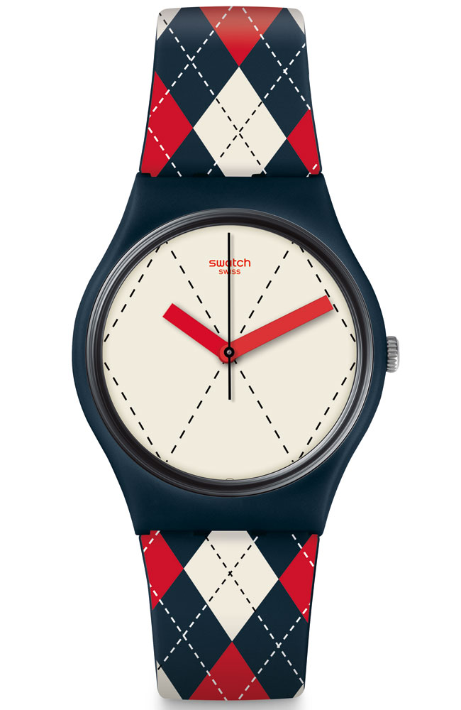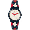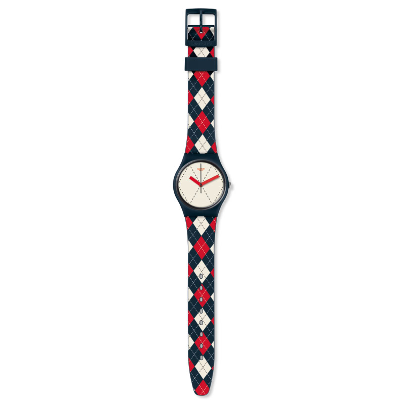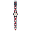 Ρολόι χειρός Swatch ελβετικής κατασκευής με λευκό καντράν και πολύχρωμο καουτσούκ λουράκι.
