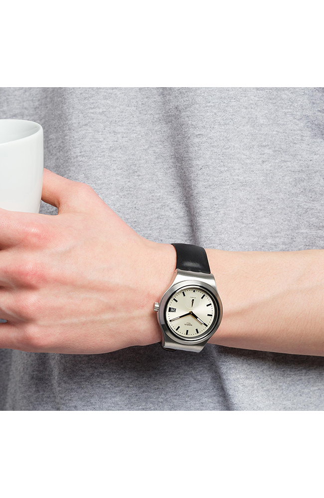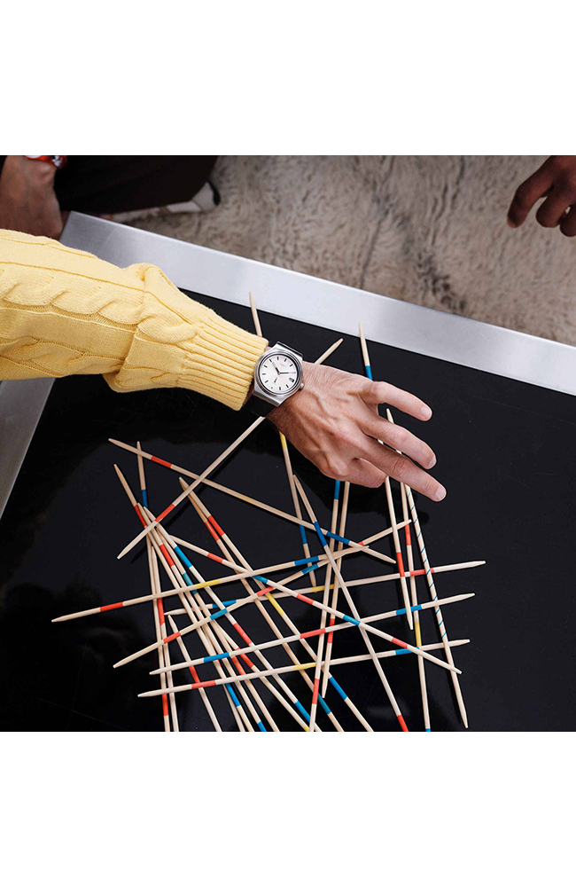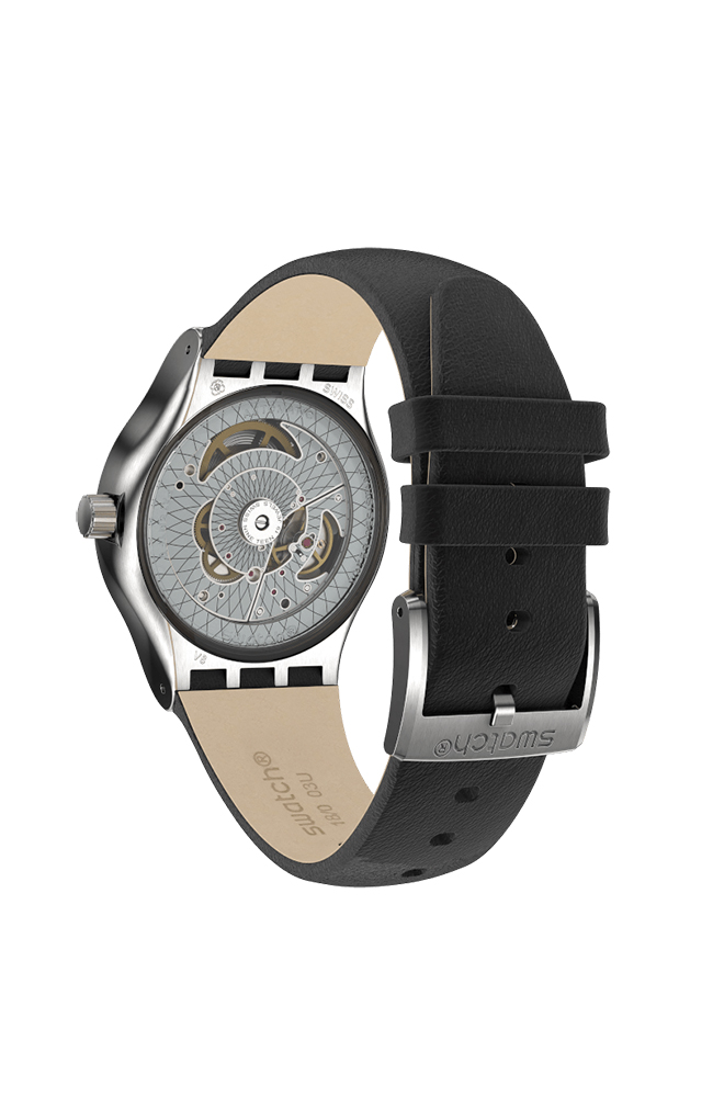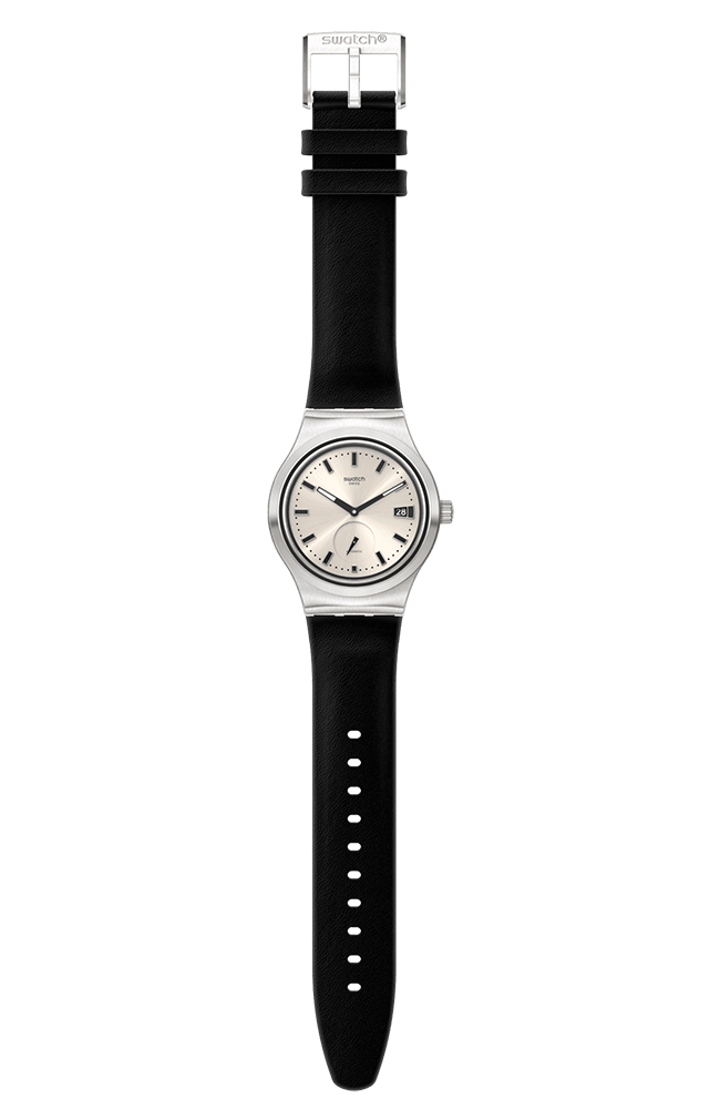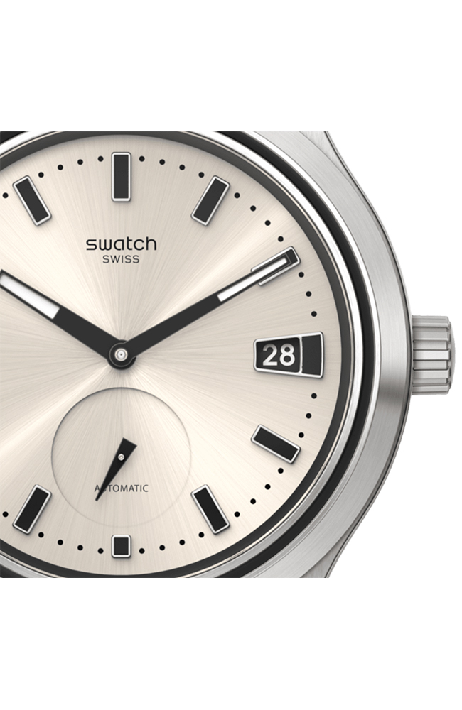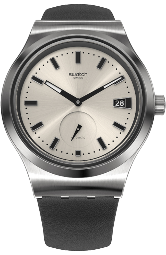 Ανδρικό ρολόι ελβετικής κατασκευής Swatch με αυτόματο μηχανισμό, λευκό καντράν και δερμάτινο λουράκι