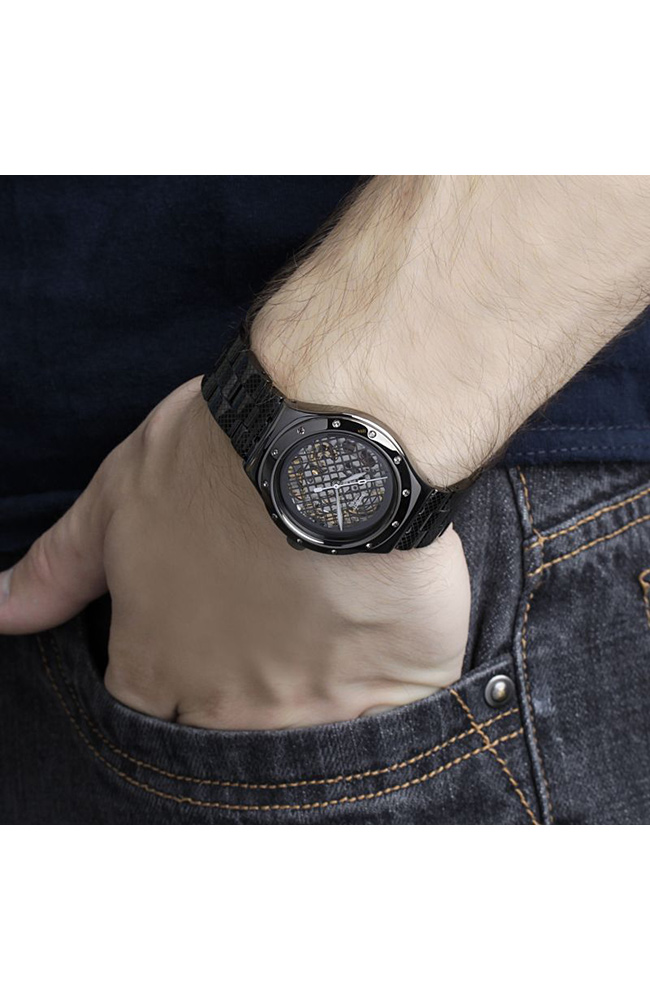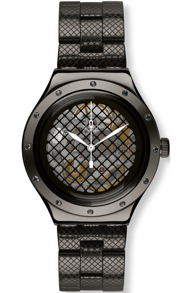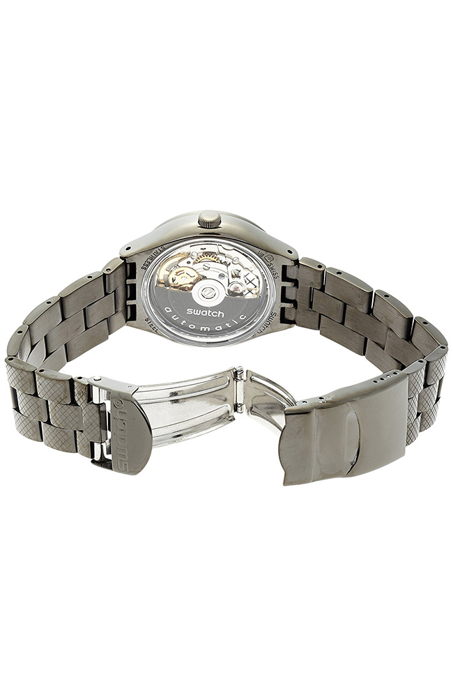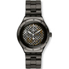 Γυναικείο ρολόι ελβετικής κατασκευής Swatch με αυτόματο μηχανισμό, από μαύρο ανοξείδωτο ατσάλι με μαύρο καντράν και μπρασελέ.