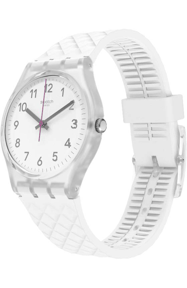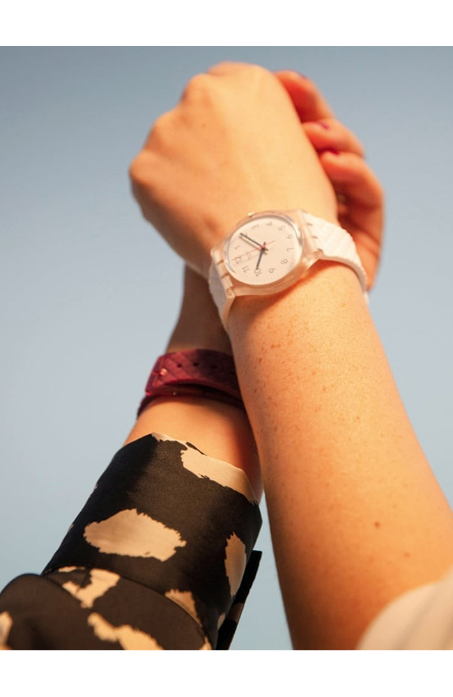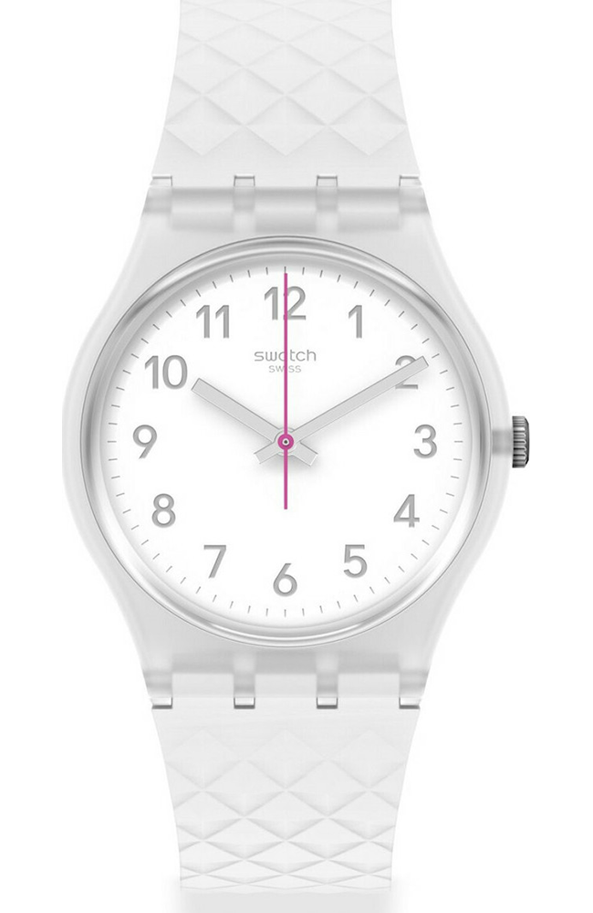 Γυναικείο ρολόι χειρός Swatch ελβετικής κατασκευής με λευκό καντράν και καουτσούκ λουράκι.