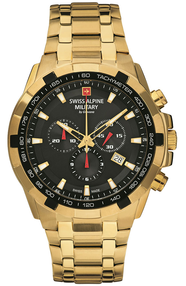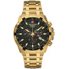 Ανδρικό ρολόι χρονογράφος Swiss Alpine Military από επιχρυσωμένο ανοξείδωτο ατσάλι με μαύρο καντράν και χρυσό μπρασελέ.