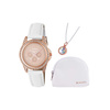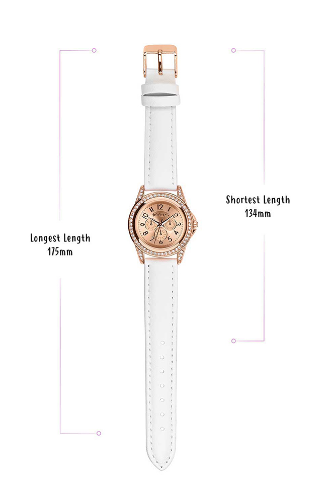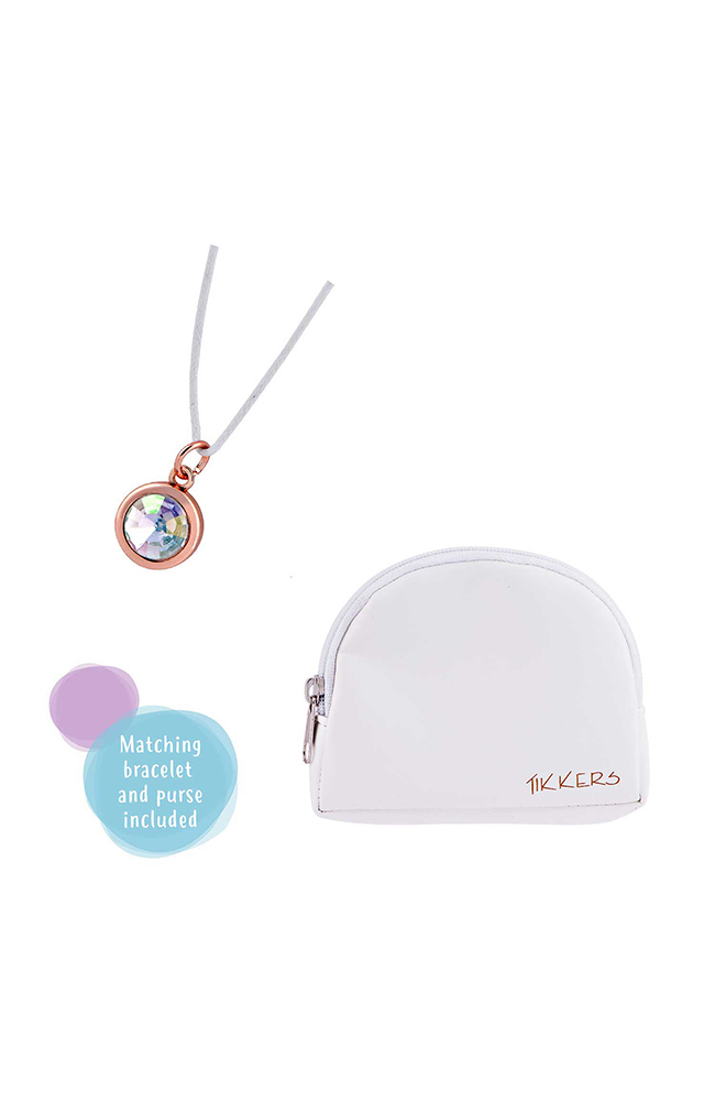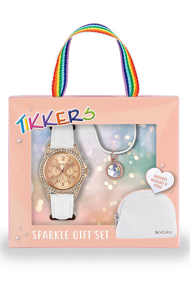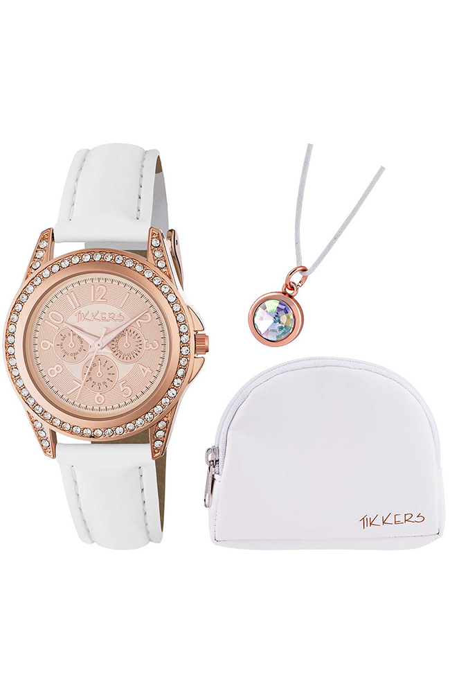 Σας παρουσιάζουμε το παιδικό ρολόι Tikkers με ιδιαίτερο καντράν! Το ρολόι σε τόνους ροζ χρυσού συμπληρώνεται από μια εντυπωσιακή στεφάνη γεμάτη ζιργκόν. Το καντράν έχει ένα εφέ σε ροζ χρυσό χρώμα που συμπληρώνεται από δείκτες και αριθμούς. Το ρολόι έχει φινίρισμα με απαλό λευκό λουράκι PU και αγκράφα σε ροζ χρυσό. Το σετ περιλαμβάνει επίσης ένα λευκό πορτοφόλι και ένα απλό ημιδιαφανές ροζ κολιέ , όλα συσκευασμένα σε μια όμορφη συσκευασία δώρου Tikkers. Όλα τα ρολόγια Tikkers έχουν εγγύηση ενός έτους.