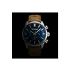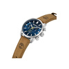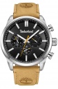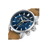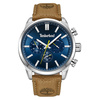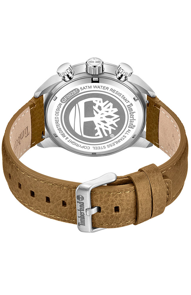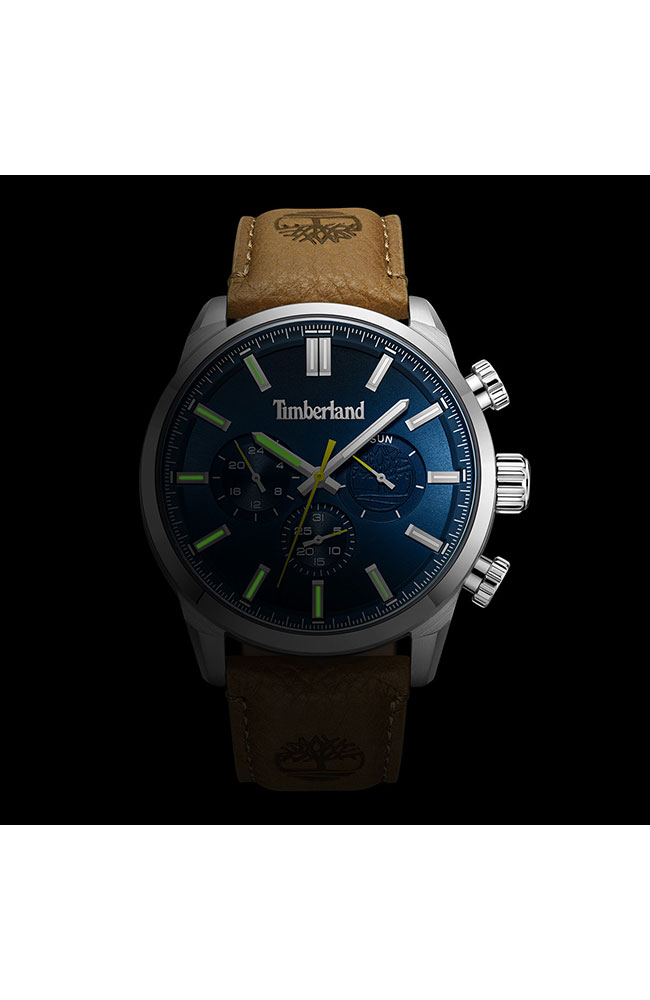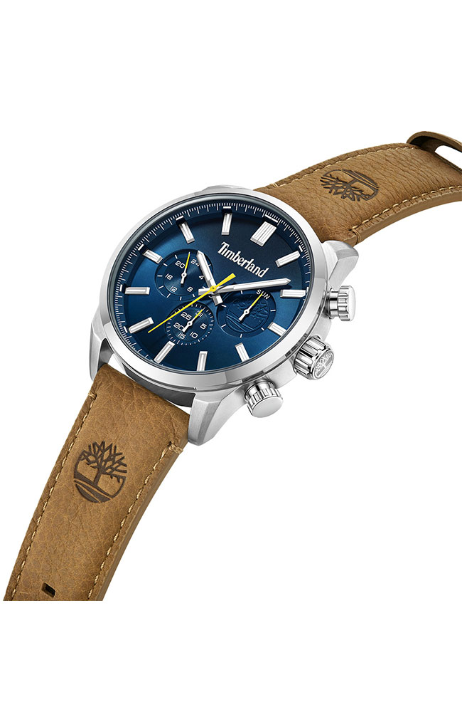 Ανδρικό ρολόι χειρός Timberland από ανοξείδωτο ατσάλι με μπλε καντράν και καφέ δερμάτινο λουράκι.
