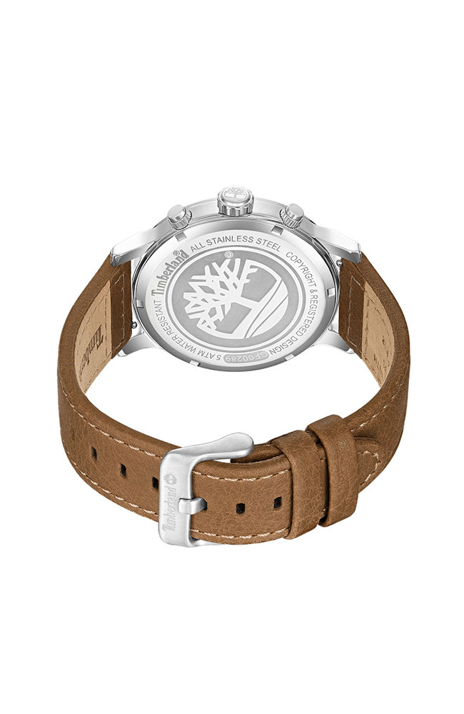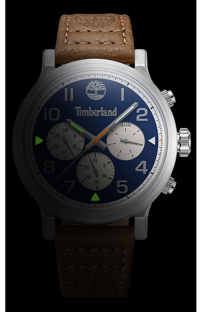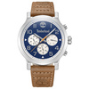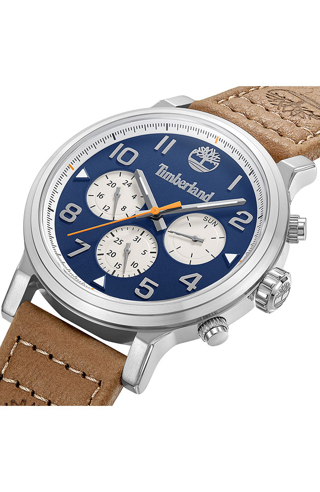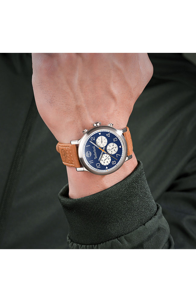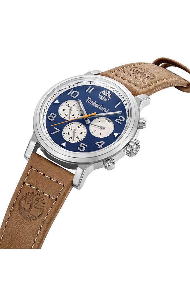 Ανδρικό ρολόι χειρός Timberland από ανοξείδωτο ατσάλι με μπλε καντράν και καφέ δερμάτινο λουράκι.