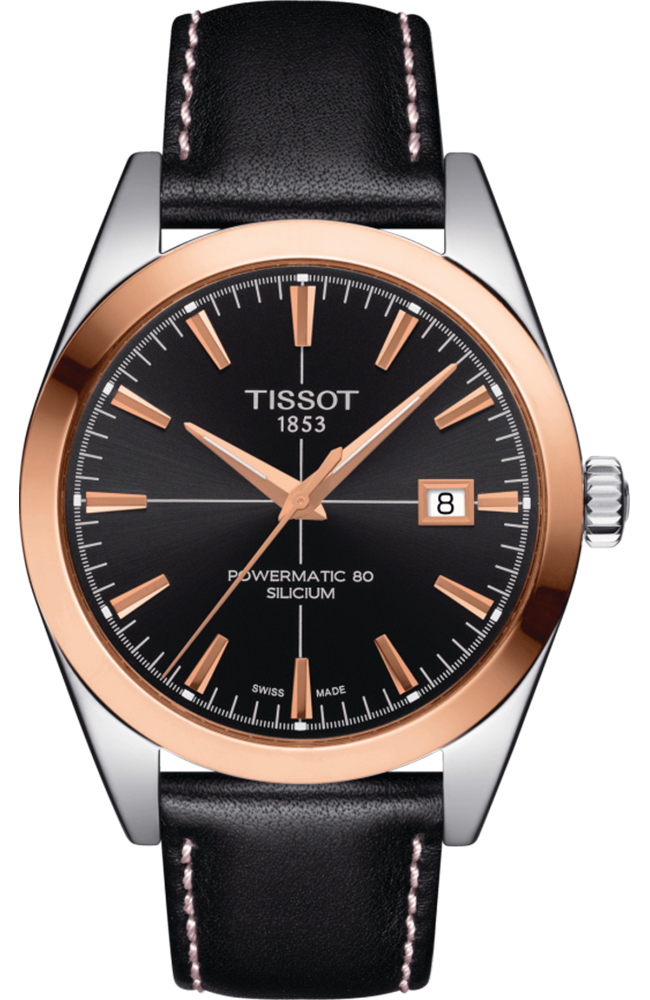 Ανδρικό Ρολόι Tissot Ελβετικό με αυτόματο μηχανισμό από ανοξείδωτο ατσάλι και στεφάνη από χρυσό 18 καρατίων με μαύρο καντράν και δερμάτινο λουράκι.