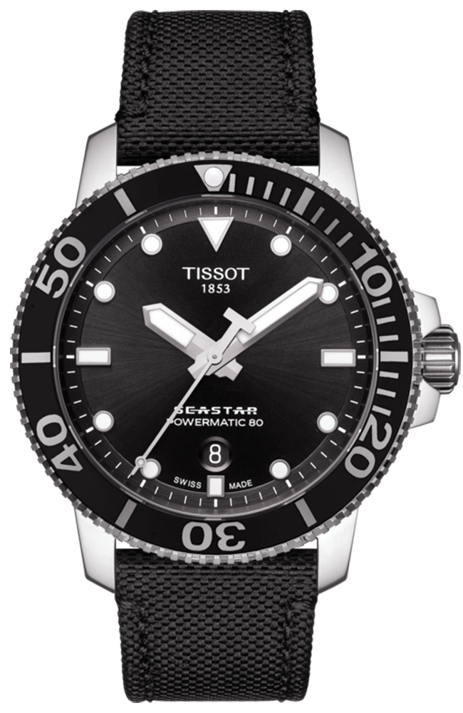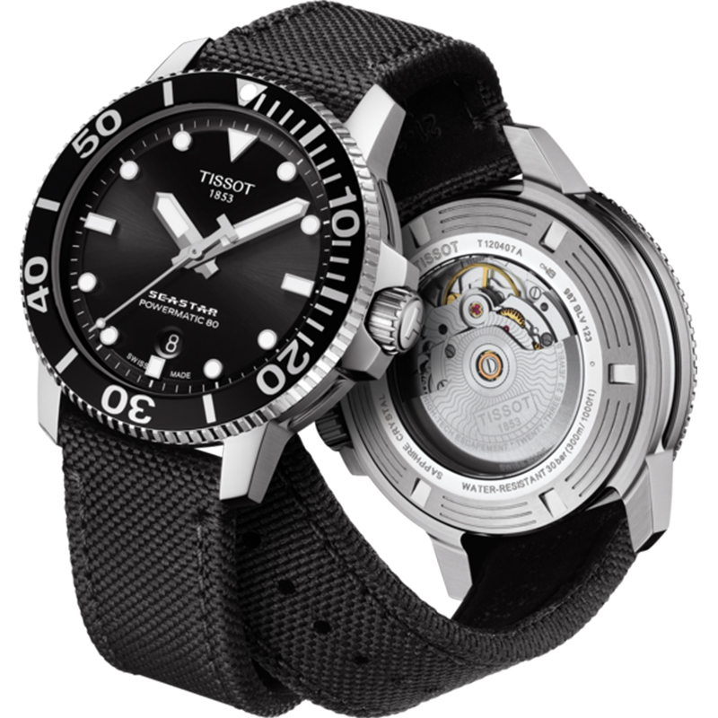 Ανδρικό ρολόι Tissot ελβετικής κατασκευής με αυτόματο μηχανισμό, από ανοξείδωτο ατσάλι με μαύρο καντράν και μαύρο υφασμάτινο λουράκι.