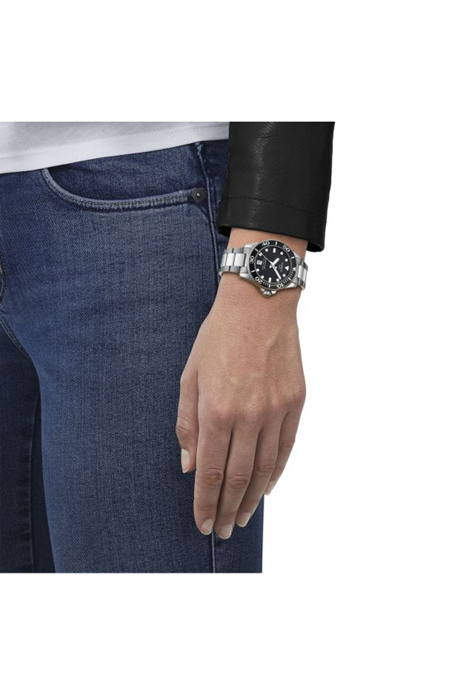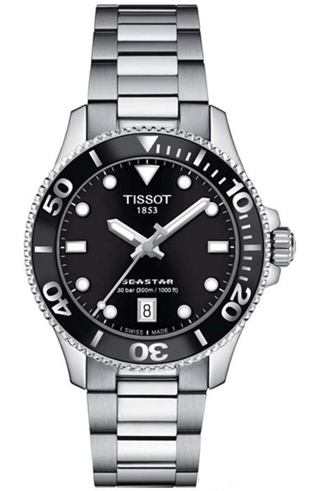 Γυναικείο Ρολόι Tissot Ελβετικής κατασκευής από ανοξείδωτο ατσάλι με μαύρο καντράν και μπρασελέ.