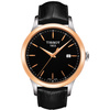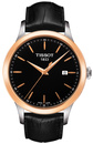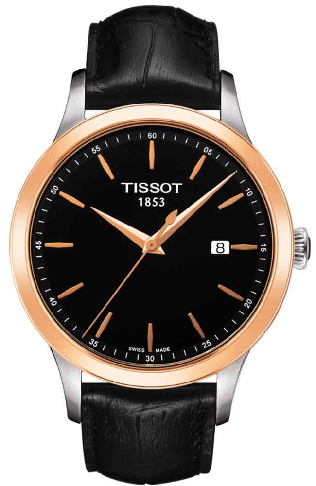 Ανδρικό Ρολόι Tissot Ελβετικής κατασκευής από ανοξείδωτο ατσάλι με χρυσό στεφάνι 18Κ με μαύρο καντράν και μαύρο δερμάτινο λουράκι.