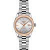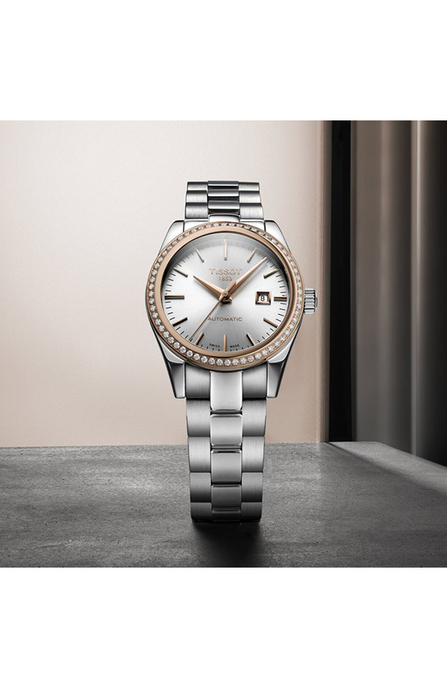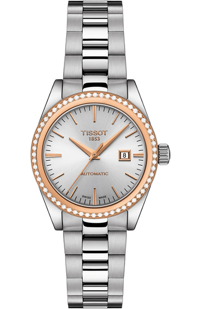 Γυναικείο ρολόι Tissot Ελβετικής κατασκευής από 18 καράτια χρυσή στεφάνη με διαμάντια, ασημί καντράν και μπρασελέ.