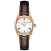 Γυναικείο ρολόι χειρός Tissot Ελβετικής κατασκευής από ροζ επιχρυσωμένο ανοξείδωτο ατσάλι με λευκό καντράν και καφέ δερμάτινο λουράκι.