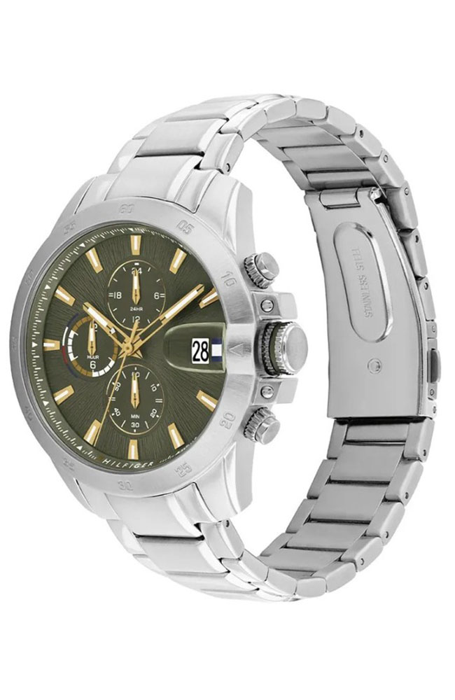 Ανδρικό ρολόι Tommy Hilfiger από ανοξείδωτο ατσάλι με χακί καντράν και ασημί μπρασελέ.