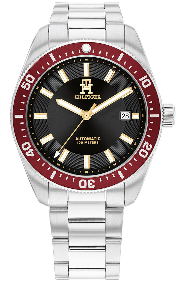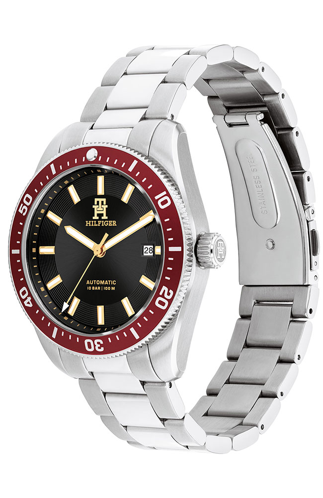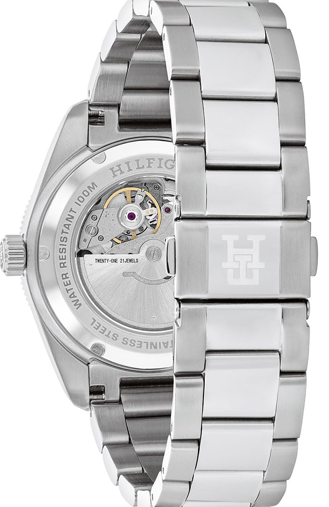 Ανδρικό ρολόι Tommy Hilfiger με αυτόματο μηχανισμό από ανοξείδωτο ατσάλι με μαύρο καντράν και ασημί μπρασελέ.