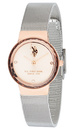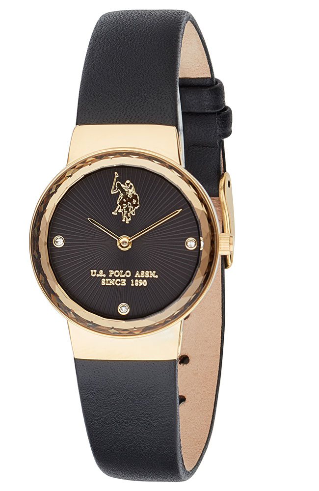 Γυναικείο ρολόι U.S. Polo με μαύρο καντράν, πέτρες Ζιργκόν και μαύρο δερμάτινο λουράκι.