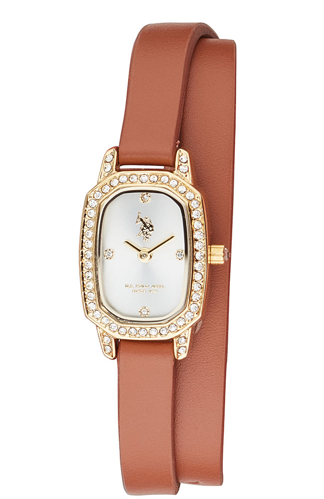 Γυναικείο ρολόι U.S. Polo με λευκό καντράν, πέτρες Ζιργκόν και καφέ δερμάτινο λουράκι.