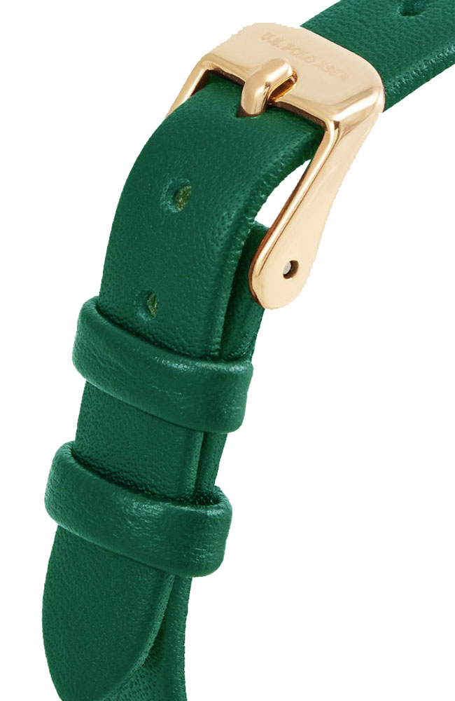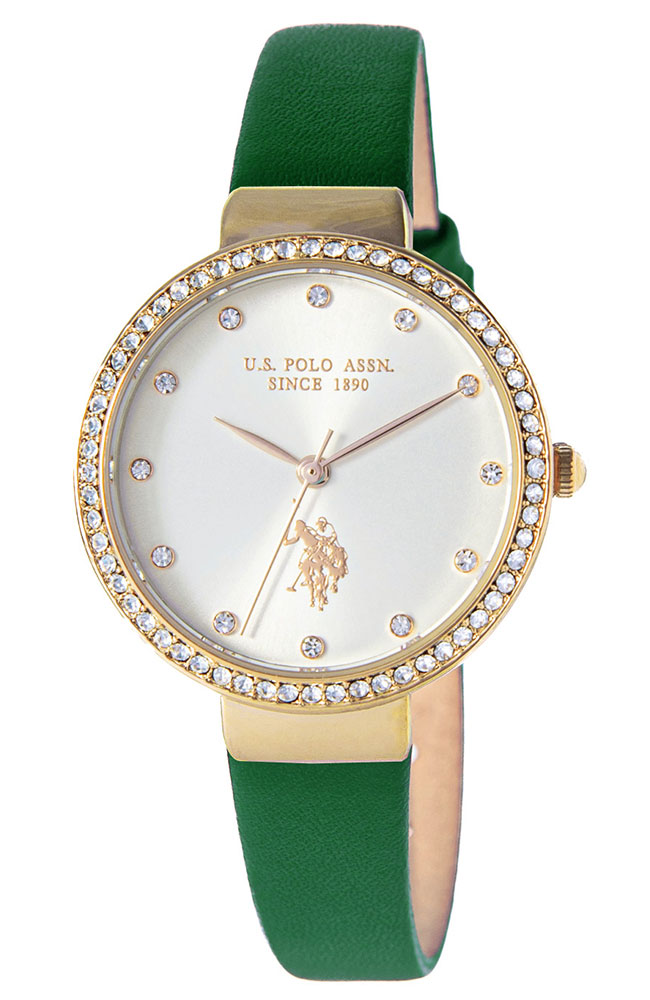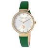 Γυναικείο ρολόι U.S. Polo με λευκό καντράν, πέτρες Ζιργκόν και πράσινο δερμάτινο λουράκι.