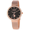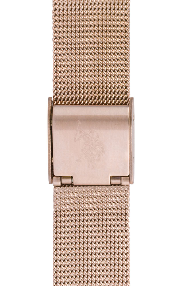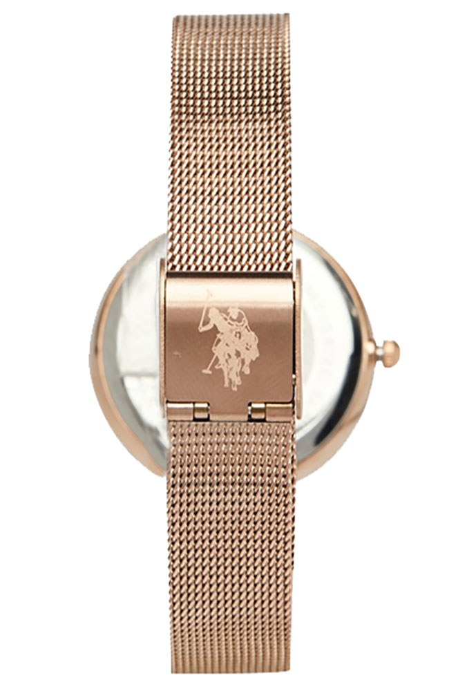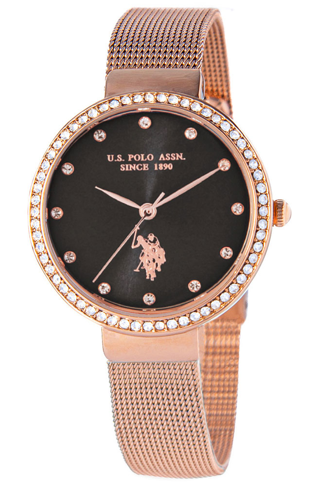 Γυναικείο ρολόι U.S. Polo με μαύρο καντράν, πέτρες Ζιργκόν και ροζ χρυσό μπρασελέ.