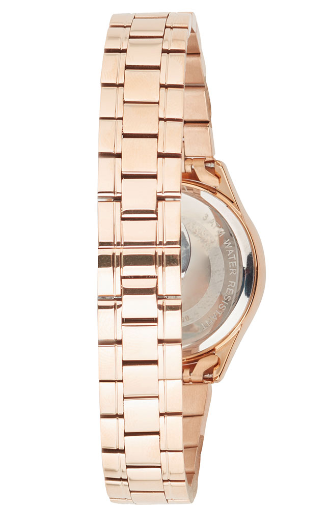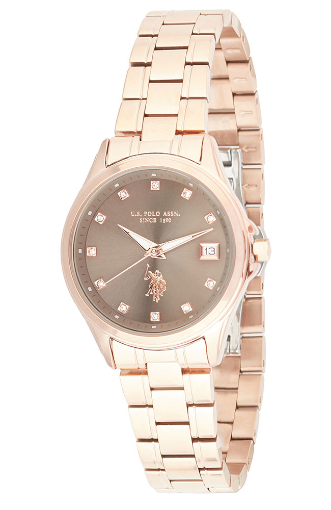 Γυναικείο ρολόι U.S. Polo με καφέ καντράν, πέτρες Ζιργκόν και ροζ χρυσό μπρασελέ.